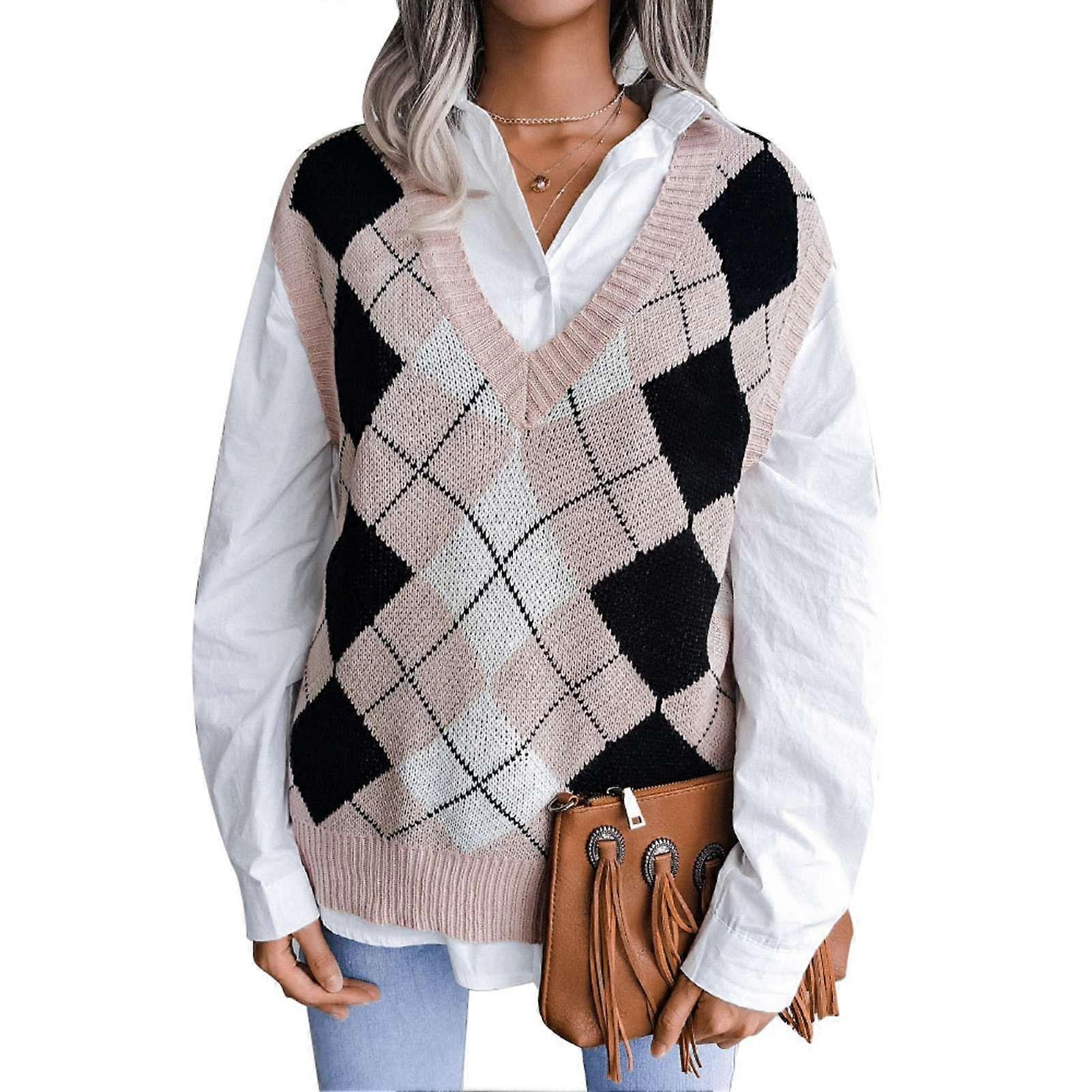 Womens Sleeveless Sweater Vest V Neck Plaid Loose Casual Stylish Skin Friendly Pullover Sweater Vest for Fall and Winter Pink S