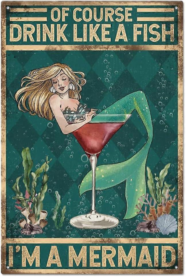 "Drink Like a Fish" Vintage Wine Glass Mermaid Metal Tin Sign Plaque Poster 8x12inch Retro Metal Wall Decorative Tin Signs for Home Kitchen Bar Coffee