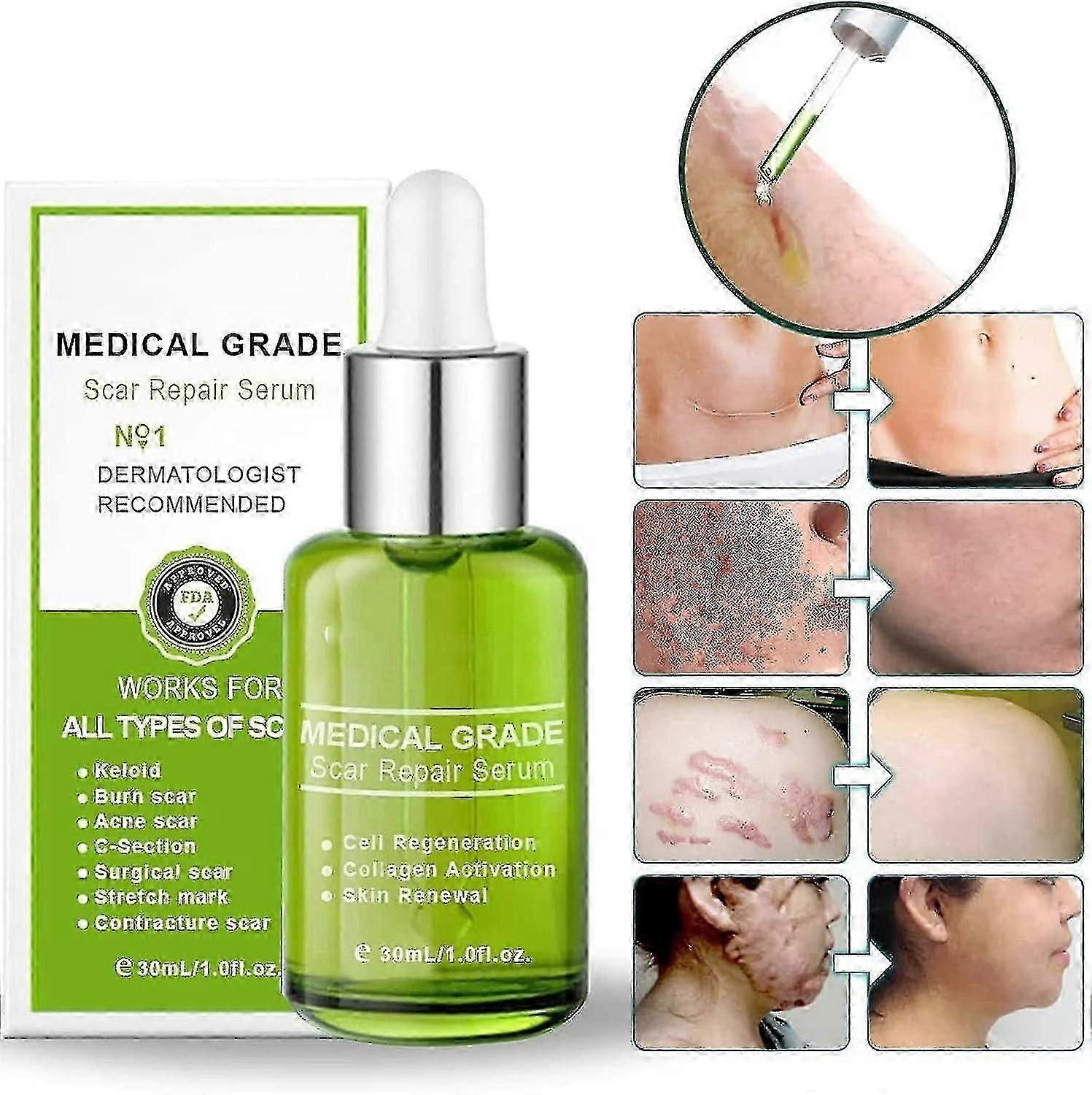 Advanced Scar Repair Serum is formulated to help promote skin firmness and elasticity, reducing the appearance of most types of scars. This scar serum improves the appearance of old and new scars related to C-sections, stretch marks, acne, surgery, and burns.Medical Grade Scar Repair Essence After skin damage, the body produces excessive free radicals and inflammatory reactions, leading to scar formation. Vitamin E can neutralize free radicals, reduce inflammatory reactions, promote scar healing, and reduce scar formation.The scar removal spray is highly effective care and ultimately provides customers with the most gentle and skin-friendly nutrition, suitable for all skin types.Facial Acne Scar Treatment Medical Grade Scar Repair Serum forms a breathable layer, increases skin hydration, protects scar tissue, normalizes collagen synthesis and balances the skin growth process so your skin looks smooth and evenSuitable for All Skin Our medical-grade scar repair serum contains only natural ingredients with parabens, sulfates and fragrance-free ingredients to release and ensure it's suitable for the most sensitive skin, helping to smooth and smooth all skin. Types of scar texture make.
