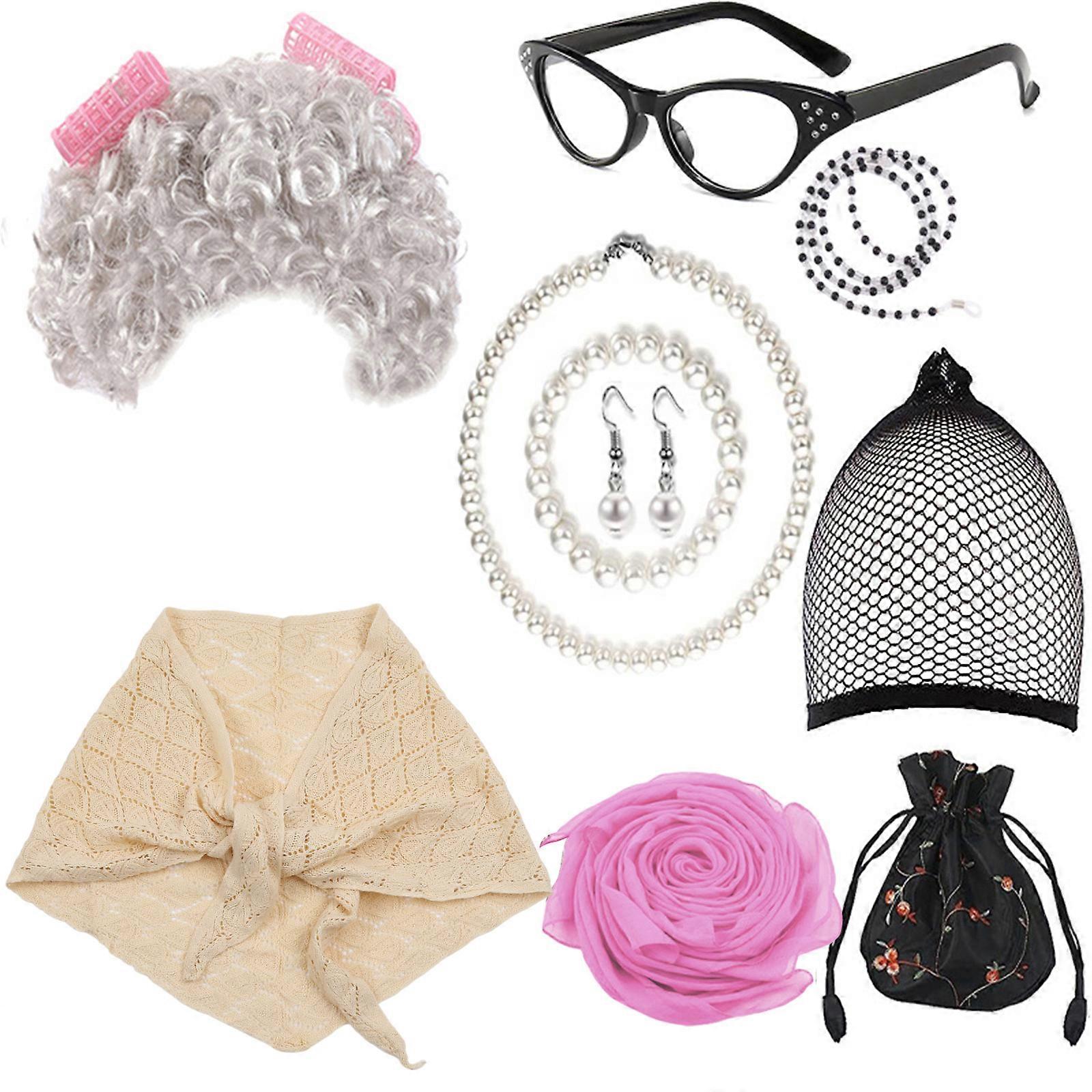 Old Lady Cosplay Costume Set Granny Wigs Glasses Necklace Shawl Costume Accessories for Halloween Masquerade Party Props