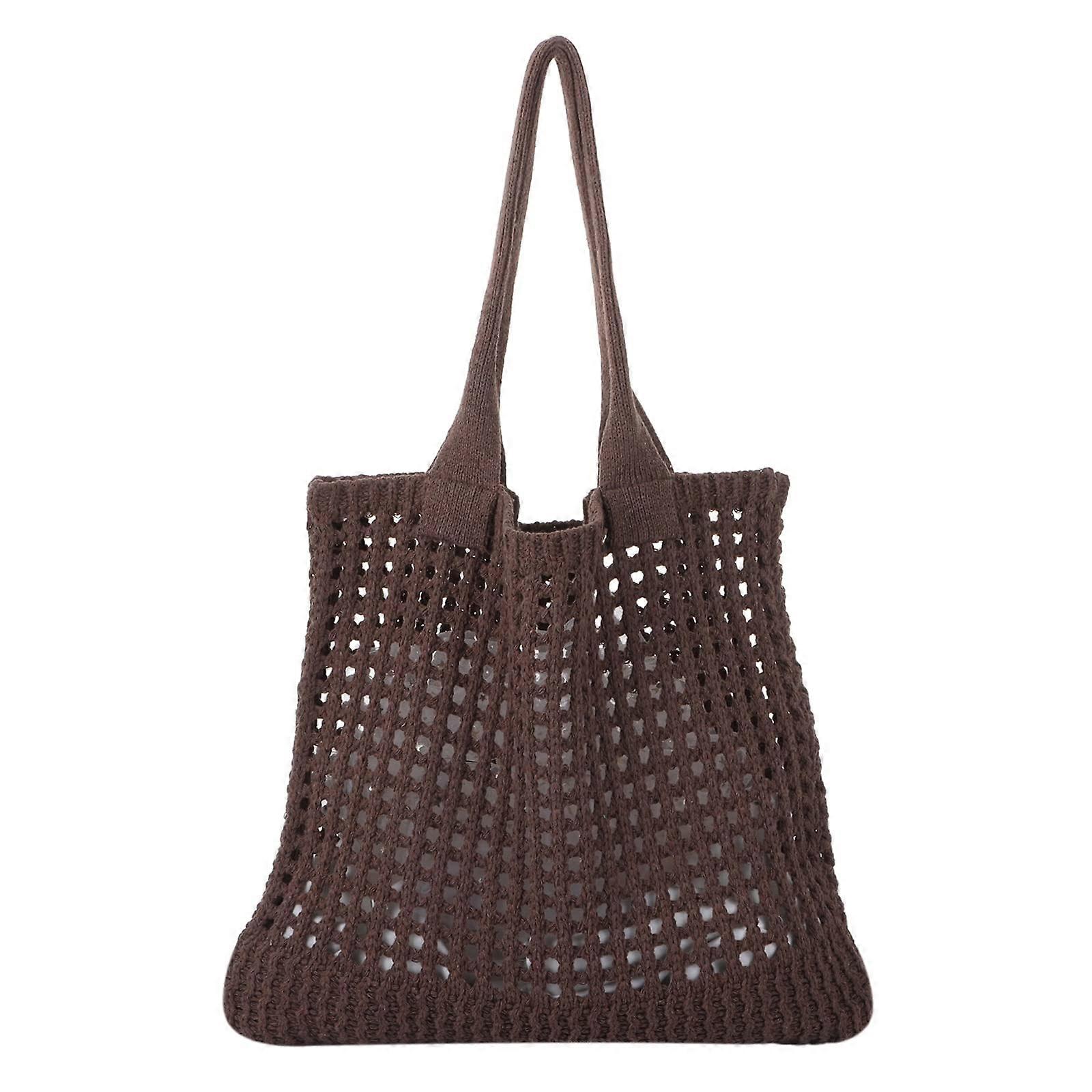 Crochet Beach Tote Bag Summer Holiday Knitting Small Beach Bag Y2k Aesthetic Fairy Tale Boho Tote Bag F03-Coffee