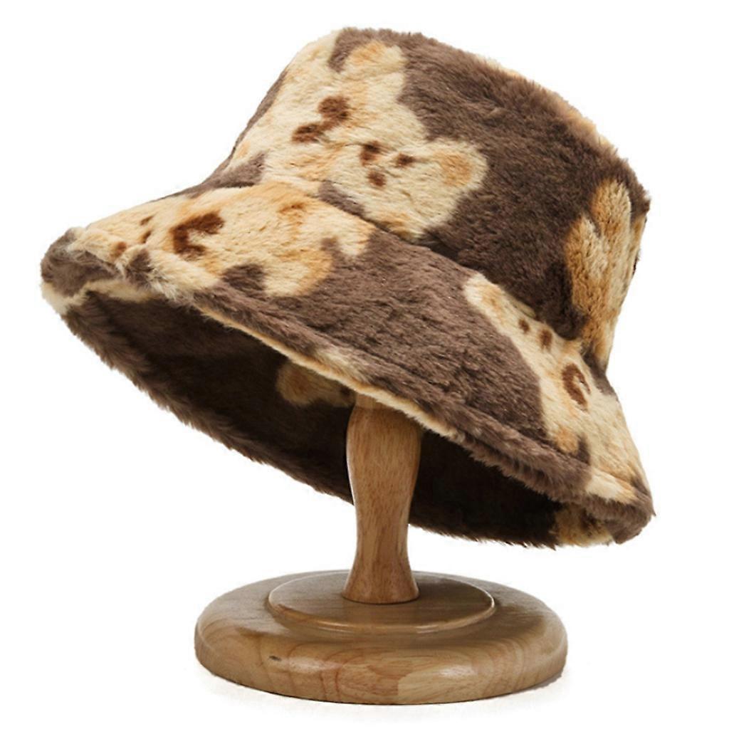 Cute Bear Pattern Fluffy Bucket Hat Bear Print Fisherman Hat Trend Plush Bucket Hat Outdoor Trend Autumn Winter All-matc Khaki