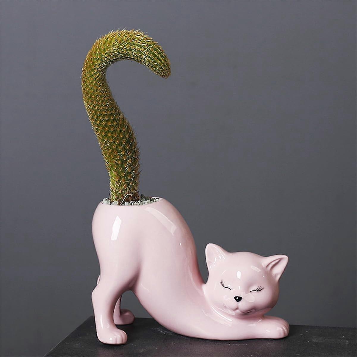 Cute Tailless Cat Ceramic Flowerpot, Lovely Animal Cactus Pot, Small Kitty Vase for Indoor Outdoor Decor, Ideal Gift for Cat Lovers (Pink)