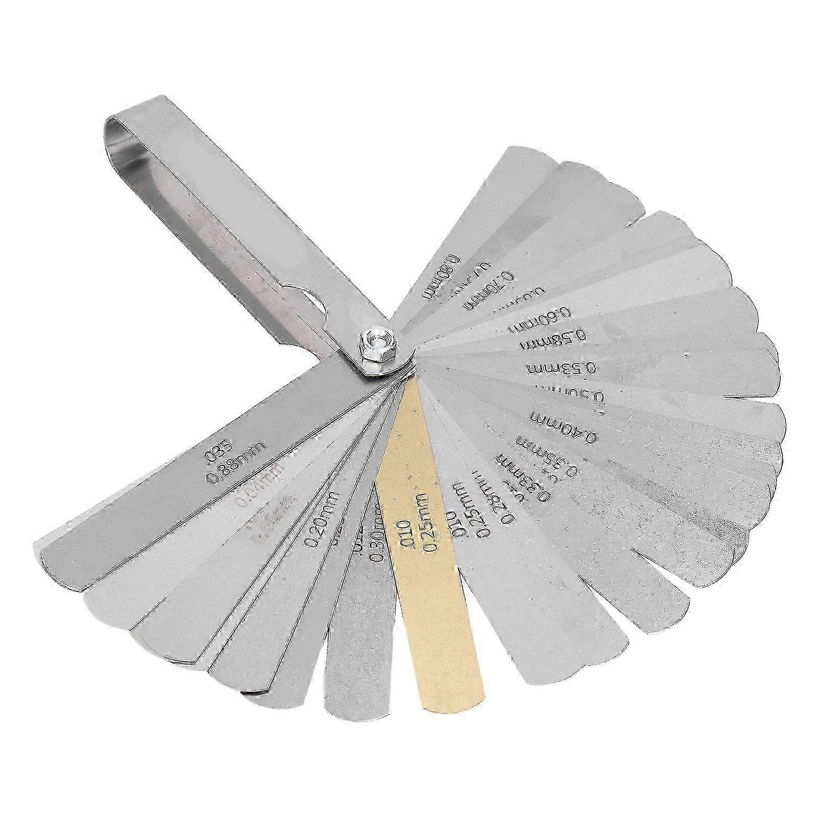 Item Type: Feeler Gauge Material: Stainless Steel Overall Length: Approx. 95mm / 3.74in Thickness(mm): 0.04, 0.05, 0.06, 0.08, 0.10, 0.13, 0.15, 0.18, 0.20, 0.23, 0.25, 0.25 (brass), 0.28, 0.30, 0.33, 0.35, 0.38, 0.40, 0.43, 0.45, 0.48, 0.50, 0.53, 0.55, 0.58, 0.60, 0.63, 0.65, 0.70, 0.75, 0.80, 0.88.