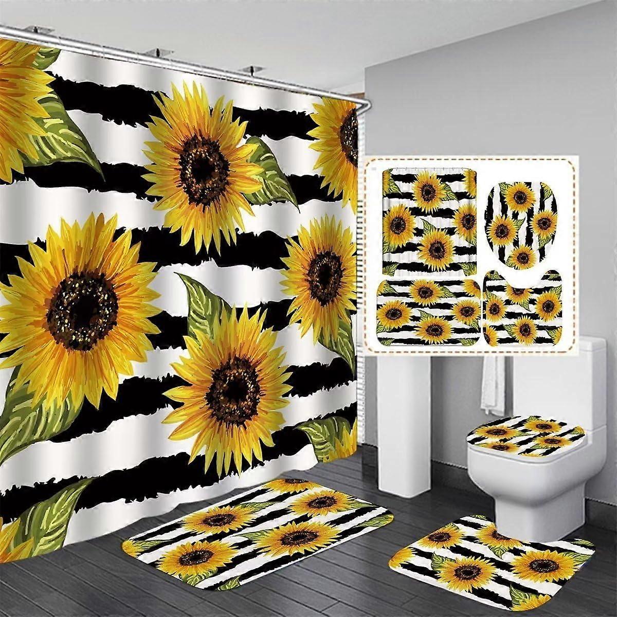 Product DescriptionWelcome to our KVITWO store! The package includes: Shower Curtain X 1 Hooks X 12 Bath mat X 1 Contour Mat X 1 Toilet lid cover mat X 1 Sunflower shower curtain sets. The flower language of sunflowers is silent love. May you always be sunny, and you will always be my sunshine. With clear printing and dyeing, decorate the bathroom while also protecting your personal privacy. Best Home Decoration for You! Material:The shower curtain is made of polyester material, which is waterproof and durable. The bathroom mat with the same pattern as the shower curtain is made of flannel, which is soft and absorbent; The back of the floor mat is designed with PVC anti slip. Easy installation:Equipped with 12 plastic hooks, easy installation and disassembly. Regarding cleaning:Hand wash or machine wash in cold water, it is not recommended to mix with other clothes. Air dry naturally. If you need to iron, please use low temperature. Tips: 1.Due to manual measurement of dimensions, there may be slight differences in product dimensions. 2.Due to differences in computer display, there may be slight color differences between the actual product and the screen. Package Included: 1 Shower Curtain(70.87inch*70.87inch) with 12 Hooks, 1 Bath Mat(17.7inch*29.5inch), 1 U-shaped Mat(17.7inch*14.7inch), 1 Toilet Lid Cover(14.96inch*17.3inch Softness&Comfort: Soft and comfortable handing feeling, waterproof;Bath Mat made of Polyester, Backed with non slip rubber bottom, strong and durable;Matching plastic Covered Shower Rings /Hooks, easy hang and slide Wide Application: Suitable For Bathroom, Toilet, Shower Room, Bathtub, Living Room, Kitchen, Bedroom, etc. Easy to clean and dries fast, Anti skid and safe design, keep you and your family safe Easy To Install: The shower curtain set comes with 12 plastic hooks, you don't have to worry about how to install it. Easily fits any standard size shower/tub and works with straight or curved shower rods Easy Care: Bathroom set with rugs support hand wash or machine washable in cold water, and air dry naturally. If you want to iron with an iron, please use low temperature Package Included: 1 Shower Curtain(70.87inch*70.87inch) with 12 Hooks, 1 Bath Mat(17.7inch*29.5inch), 1 U-shaped Mat(17.7inch*14.7inch), 1 Toilet Lid Cover(14.96inch*17.3inch Softness&Comfort: Soft and comfortable handing feeling, waterproof;Bath Mat made of Polyester, Backed with non slip rubber bottom, strong and durable;Matching plastic Covered Shower Rings /Hooks, easy hang and slide Wide Application: Suitable For Bathroom, Toilet, Shower Room, Bathtub, Living Room, Kitchen, Bedroom, etc. Easy to clean and dries fast, Anti skid and safe design, keep you and your family safe Easy To Install: The shower curtain set comes with 12 plastic hooks, you don't have to worry about how to install it. Easily fits any standard size shower/tub and works with straight or curved shower rods