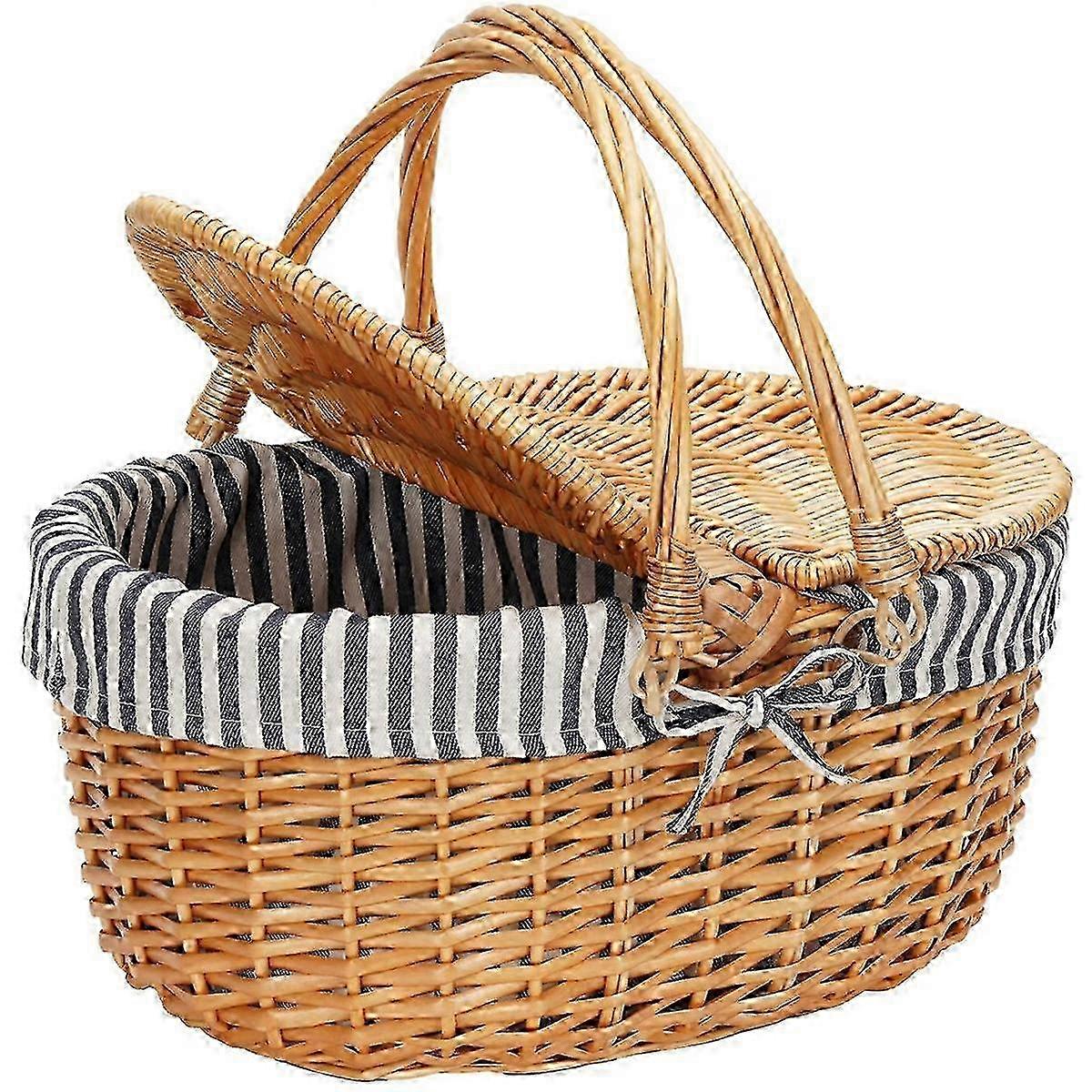 Wicker Picnic Basket with Lid,Wicker Basket with Handle and Liner, Handmade Shopping Basket,Braided