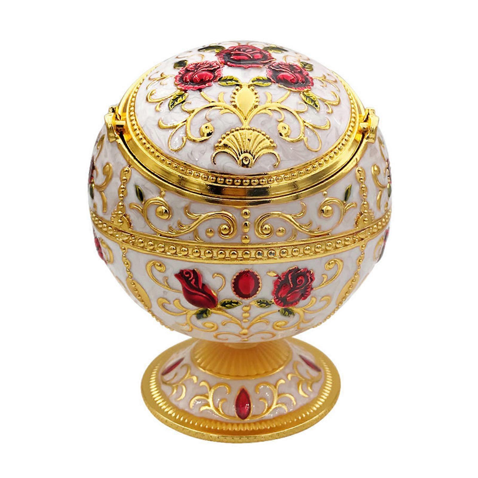 Windproof Ashtray with Lid Vintage Metal Globe Flower Pattern Cigarette Ash Tray for Home Bedroom Office Tabletop Decor WhiteGolden