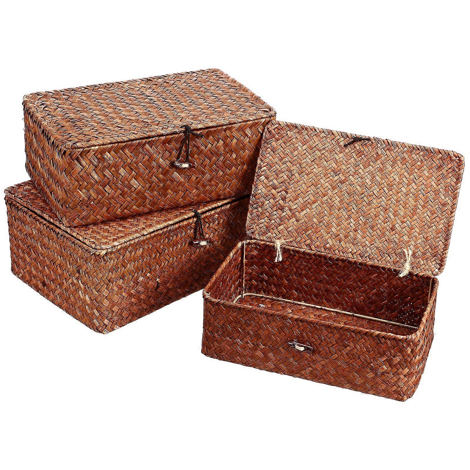 3pcs Seagrass Basket With Lid Storage Box Sundries Sorting Storage Box Household Cosmetics Organizer