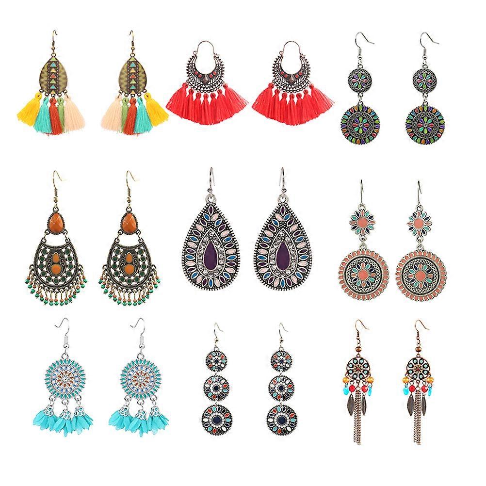 Dangle Flower Earrings Women Bohemian Style Tassel Ear Danglers Assorted Color 8.5x6cm Lightweight 9 Pairs