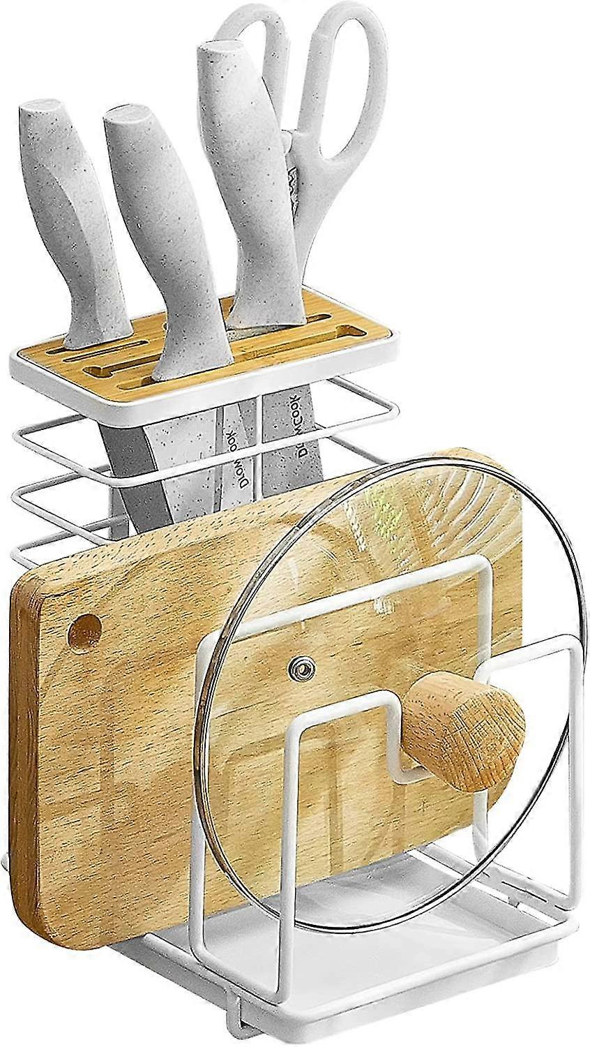 3 in 1 storage - 3 in 1 kitchenware storage solution, exclusive and sleek within easy reach, works as a pot lid holder, chopping board organizer, knife block, it will keep your kitchen countertop tidy. Keep Knives Drying Naturally - The knife holder adopted vertical hollow iron wire design to prevent your knives from rust after cleaning, perfect suitable for any kitchen, family. Wonderful home decoration and organizer. Space-saving Design - Multifunctional kitchen storage rack include 1 pot lid holder, 1 cutting board holder, 4-slot wooden knife block secures different sharp and size knives, 2 round slots for scissors and knife sharpening rod. And 1 detachable drip tray to collect dripping water to keep the countertop dry. Save your space and keep your kitchen away from a mess. Solid Construction - Our countertop kitchenware rack adds 4 anti-slip PVC feet to ensure the bottom is stable, so you don't have to worry about sliding and stability, and has a super practical pot lid bayonet design, prevent the pot lid slip out. Premium Construction - The overall size of kitchenware storage is 7.6 x 5.7 x 9.3 inches, and the width for placing pot lids and cutting boards is 2 inches. Made of high quality iron, bamboo, PS, PVC, wire coating to prevent rust. All edges are very smooth to avoid scratches and will last a long time with everyday use.