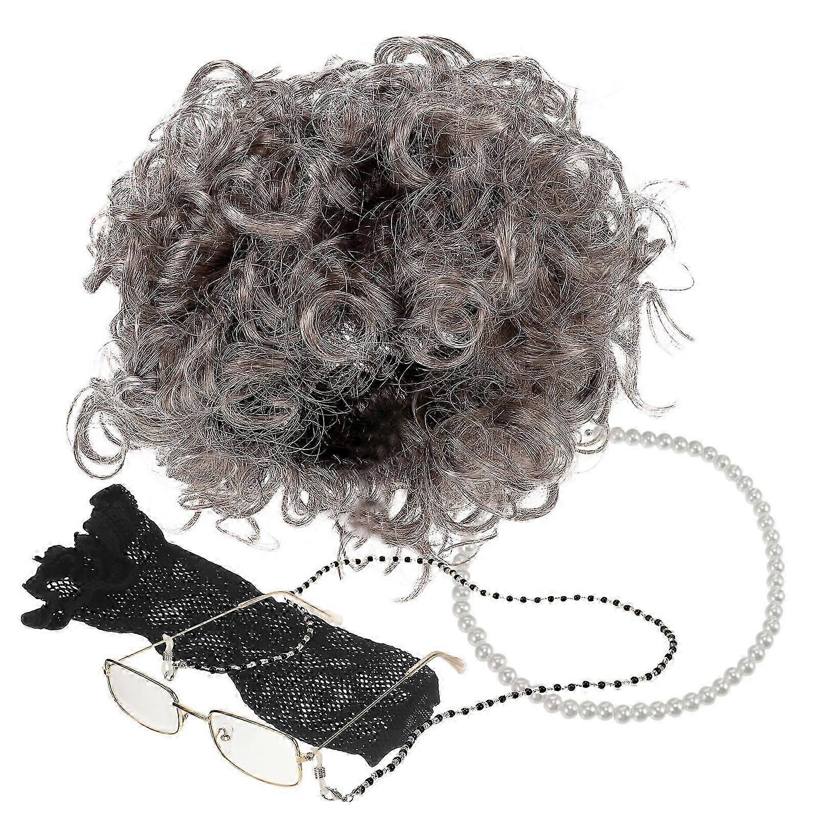 Eye Glass Chains Women Fancy Dress Glasses Cosplay Grandmother Party Wigs Old Lady Costume Set Gray Curly Performance 1Set