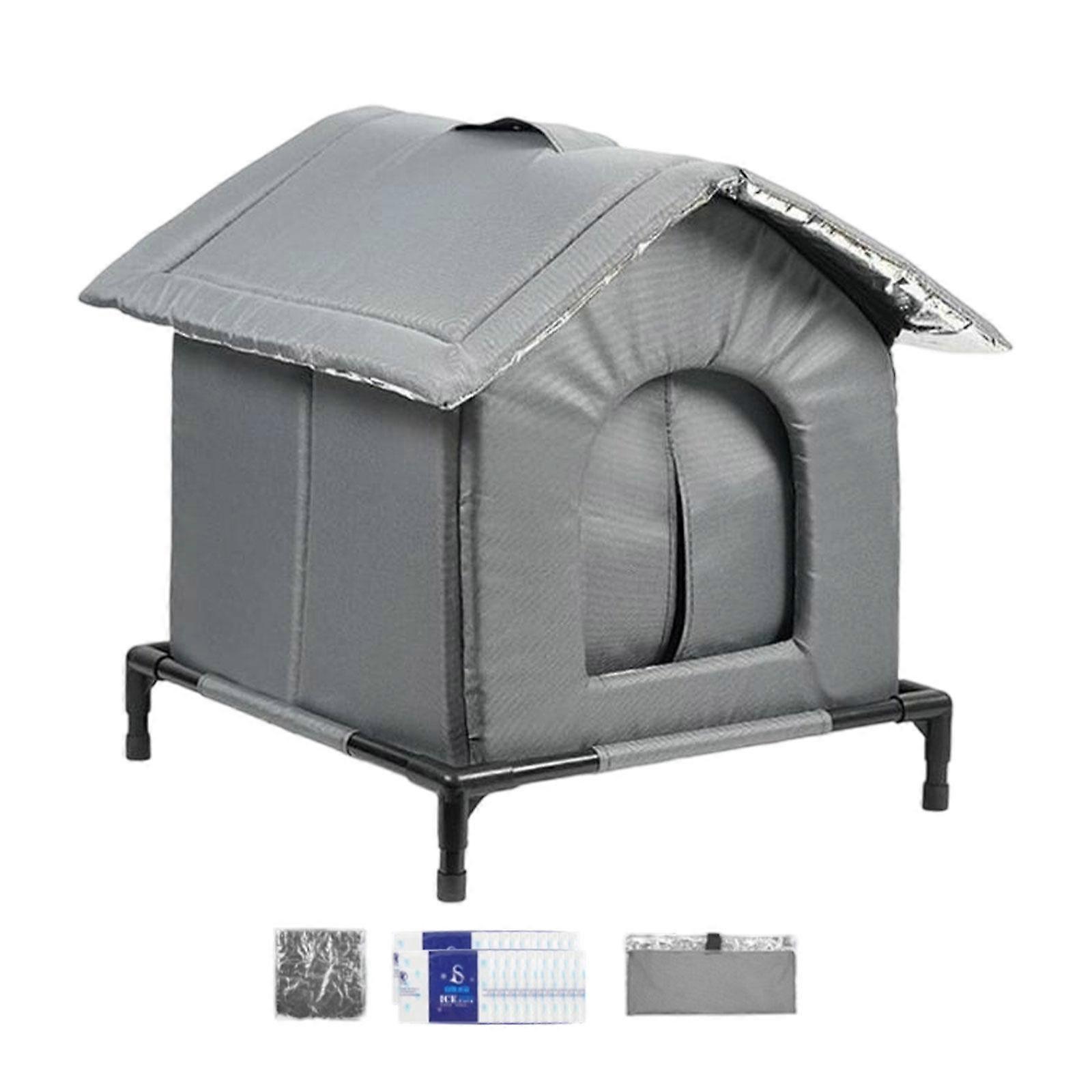 Description: 【Enhance Cooling Capability】: This pet cooling house is equipped with ice packs that effectively lower temperature, providing a refreshing and cool environment for your furry friend during the hot summer months 【Elevated stand】: The Kitten shelter is raised on sturdy feet, lifting it off the cold, damp ground, Keep the bottom clean 【Triple Layer Technology】: Elevated Cat House featuring a Oxford cloth exterior that retains coolness, an sponge middle layer, and an aluminum foil lined 【Door curtains】: Summer Cooling Cat House with door curtains reduce cold air outflow, providing reliable protection for cats 【Occasion】: This Cat House is suitable for Stray Cat House, patios, for backyards, porches, and gardens Size Chart:33cmx33cmx40cm/12.99inchx12.99inchx15.75inch Package Includes: 1 Pet Cooling House  1 Waterproof bag  20 Ice packs 1 Thickened double sided cushion Note: Please allow slightly errors 1-2cm/0.39-0.79inch differences due to manual measurement.