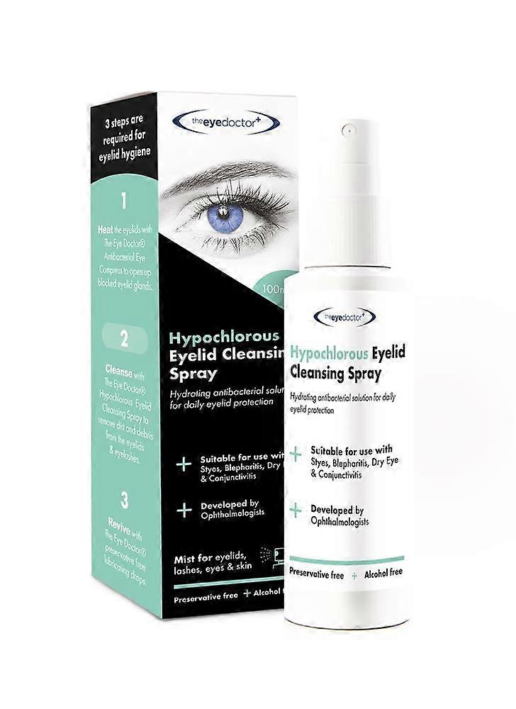 The Eye Doctor Hypochlorous Eyelid Cleansing Spray is a gentle, hypoallergenic solution formulated to cleanse, soothe, and protect the delicate skin of the eyelids and lashes. Designed with a pH balanced to be compatible with the ocular surface and natural tears, this spray helps maintain optimal eyelid hygiene while reducing the risk of inflammation that can contribute to long-term dry eye symptoms.Clinically tested and developed by ophthalmologists, this preservative and alcohol-free formula offers effective antibacterial properties without irritation, making it ideal for daily use. It is safe for sensitive eyes and skin, contact lens wearers, and individuals experiencing conditions such as Dry Eye Disease, Meibomian Gland Dysfunction (MGD), Blepharitis, styes, and eyelid inflammation. Supports eyelid and lash cleanliness Maintains ocular surface health Hypoallergenic and gentle on skin Preservative and alcohol free Contact lens compatible Clinically tested and ophthalmologist developed Accredited Menopause Friendly Suitable for daily use Can be safely sprayed onto face 100ml bottle lasts up to 3 months after openingThis versatile spray is an excellent addition to your daily eye care routine, providing relief and protection for sensitive and inflamed eyelids. Whether managing chronic eyelid conditions or seeking gentle cleansing to support eye health, The Eye Doctor Hypochlorous Eyelid Cleansing Spray offers a trusted, effective solution.