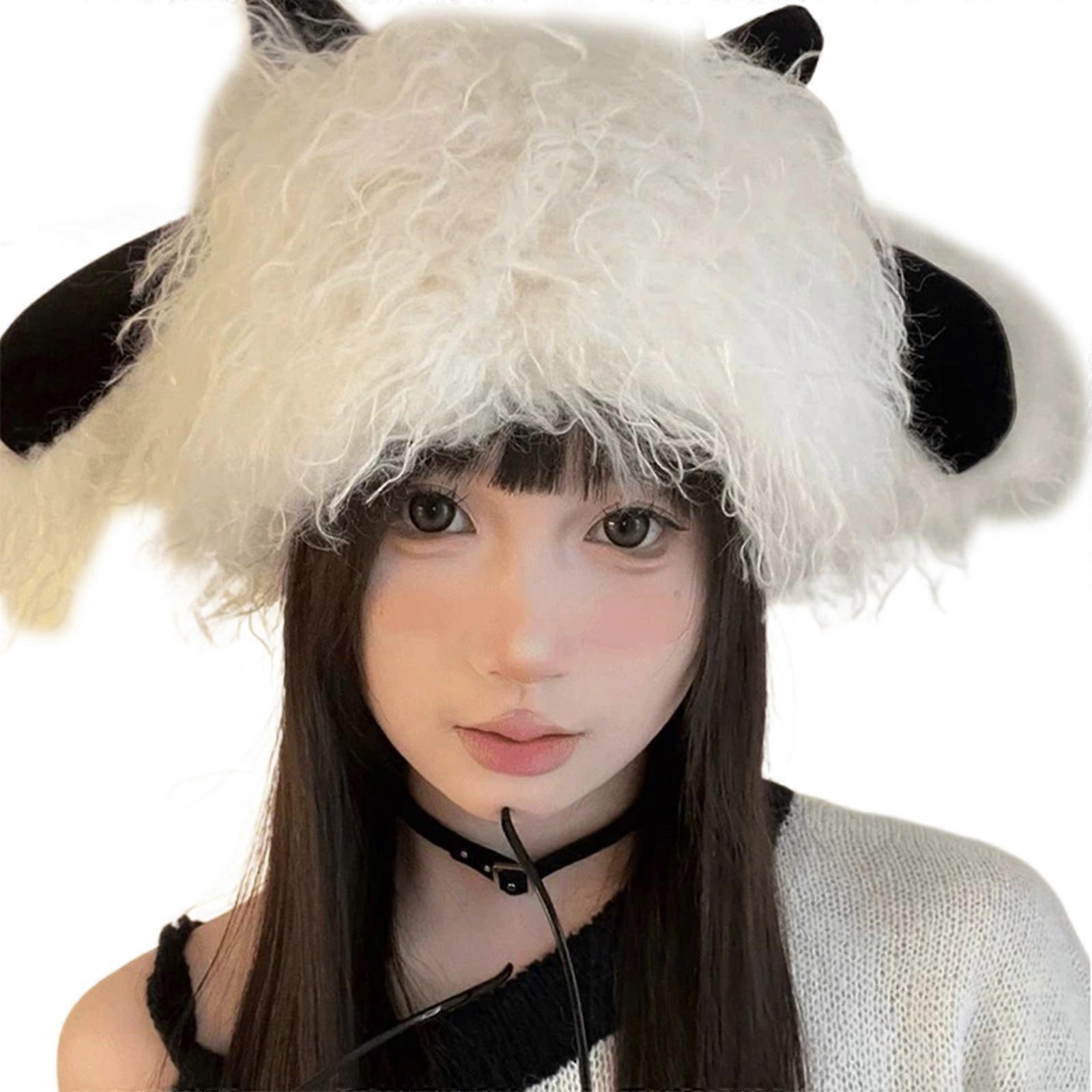 Furry Cartoon Head Cover with Horn for Outdoor Sports Furry Hat with Ear Oversized Headgear Hat for Winter White