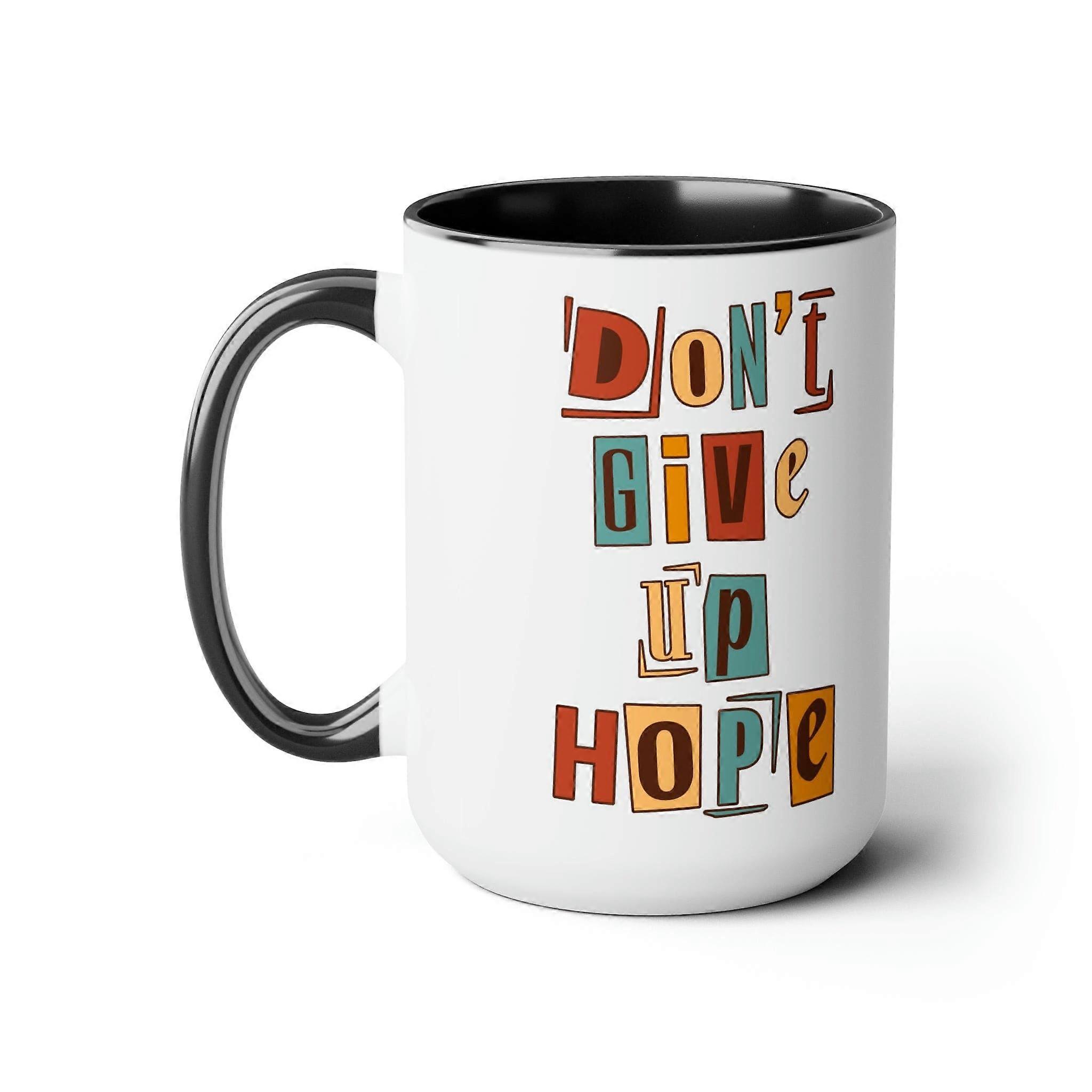 Details:Say It Soul - Don't Give Up Hope, Inspiration Ceramic Coffee Mug. Warm-up with a nice cuppa out of this two-tone accent ceramic coffee mug. This mug is perfect for your morning cup of coffee, tea, hot cocoa, or any other hot beverage. It's also great for cold beverages! The ceramic mug is microwave and dishwasher safe. It's BPA and Lead-free, and made of durable ceramic in 15-ounce size.Decorative mugs can be used for a variety of purposes. They make great gifts for friends and family, and they are also perfect for adding a personal touch to your own home. Whether you use them to hold your morning coffee or tea, or simply to display on your shelf as a decoration, decorative mugs are a great way to show your personality.White ceramic mug with colored interior and handle15 ozRounded cornersC-handleLead and BPA-freePerfect for personal use or as a gift mug