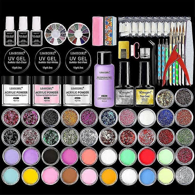 Acrylic Nail Kit Full Manicure Set With 3 Colors Acrylic Powder Liquid Glitter Nail Tips