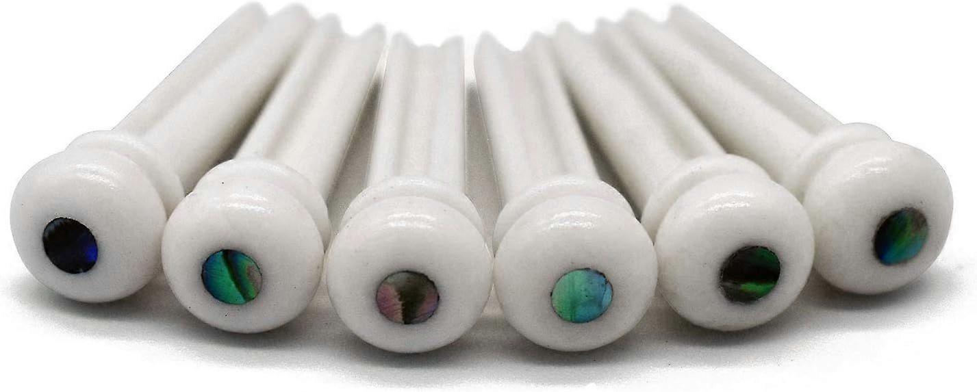 Cut from whole cattle bone, Complete bones means the transmission of sound will be more excellent.Abalone dot was inlaid the head, they improve the appearance of your guitar.Bridge pin total length:28mm. Head diameter:7.8mm. Shank diameter:5.33mm. Bottom diameter:4.2mm. Shank length:21mm. String Slot: 2mm. 3 Taper.Sufficiently large size,fit for martin, fender, gibson, taylor, ibanez,etc.Perfect replace your broken/plastic bridge pins.A free pin puller tool was included, Your right-hand man when you unload bridge pins.
