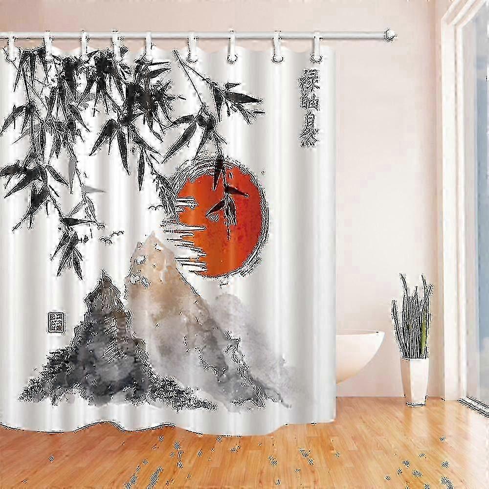 Waterproof Polyester Shower Curtain with Asian Ink Bamboo and Red Sun Landscape Design, Suitable for Various Bathroom Styles and D��cor
