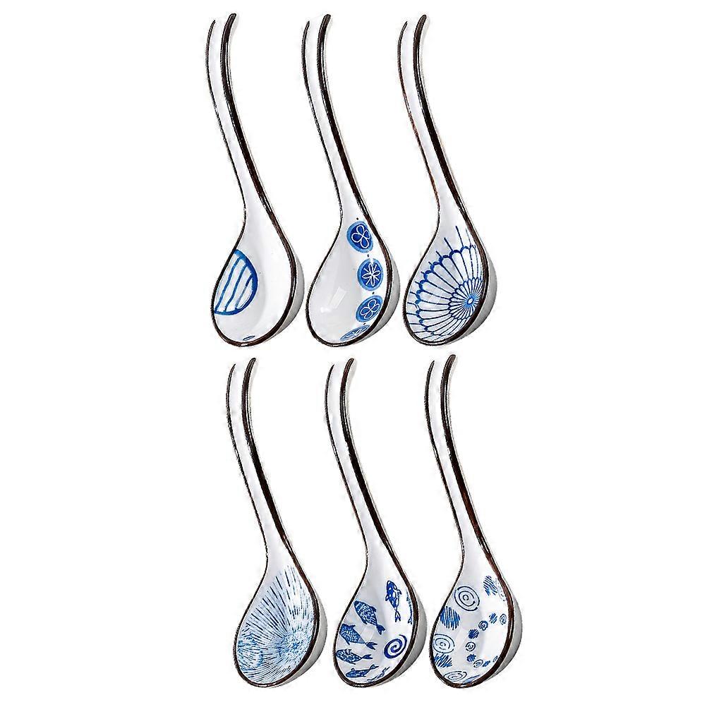 6pcs Ceramic Soup Spoons for Asian, Chinese, Ramen, Rice, Dessert Decorative Pattern, Safe Porcelain Ladle for Dining and Serving