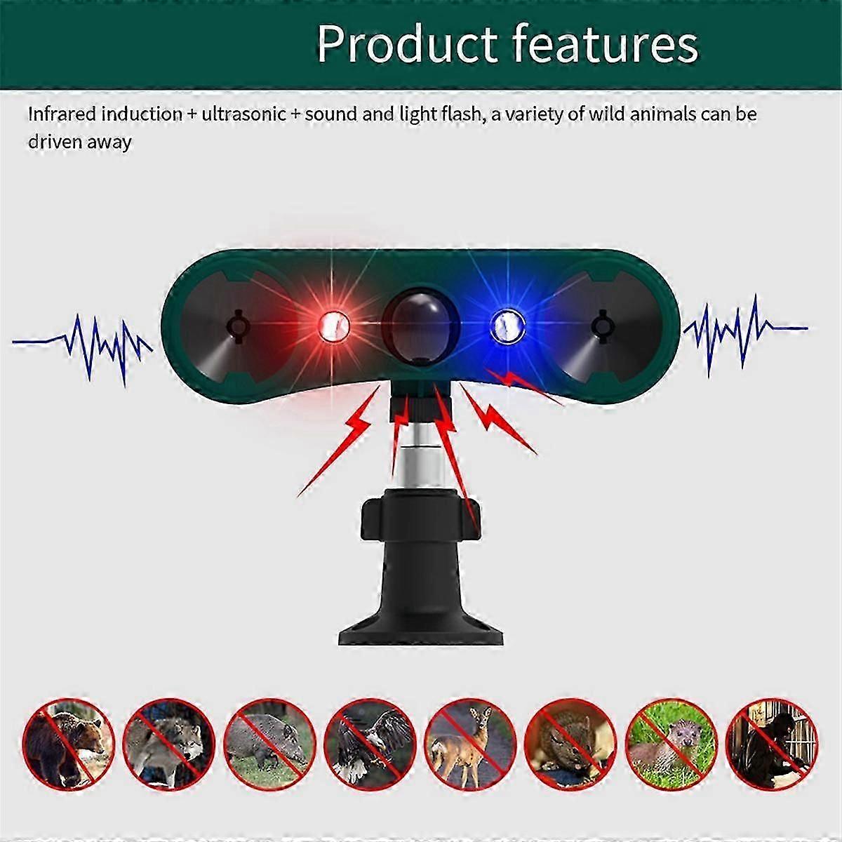 Sensing distance: 5-8 meters (affected by ring mirror temperature) Installation : ground/wall mounting Solar panel: 5Vx130mA monocrystalline solar panel Function: 1st gear, 24-hour multi-stage high-frequency ultrasonic sound and light alarm mode; 2 levels of multi-stage high-frequency ultrasonic sound and light alarm mode at night; 3 levels of 24-hour sound and light alarm modes; 4 levels of sound and light alarm modes at night Charging : solar charging Charging time: Greater than8 hours Working time: of induction, sound and light alarm 150 times, working for 8-10 on one charge, shutdown standby 300 days Alarm sound: low frequency 129 decibelsx2 channels, high frequency ultrasonic 12KHZ-44KHZx2 channels Waterproof grade: IP55 Battery: 3.7Vx1200mAH18650 lithium battery Material: plastic colour: blue Package Contents: 1 set animal repellers Only the above package content, other products are not included. Note: Light reflection and different displays may cause the color of the item in the picture a little different from the real thing. The measurement allowed error is +/- 1-3cm.
