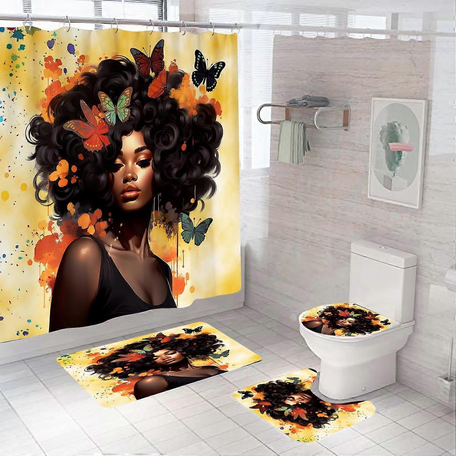 African American Shower Curtain Set, Black King Queen Bath Set with Toilet Cover, Bath Mat, Hooks, Waterproof Fabric for Home Decor (139 characters)