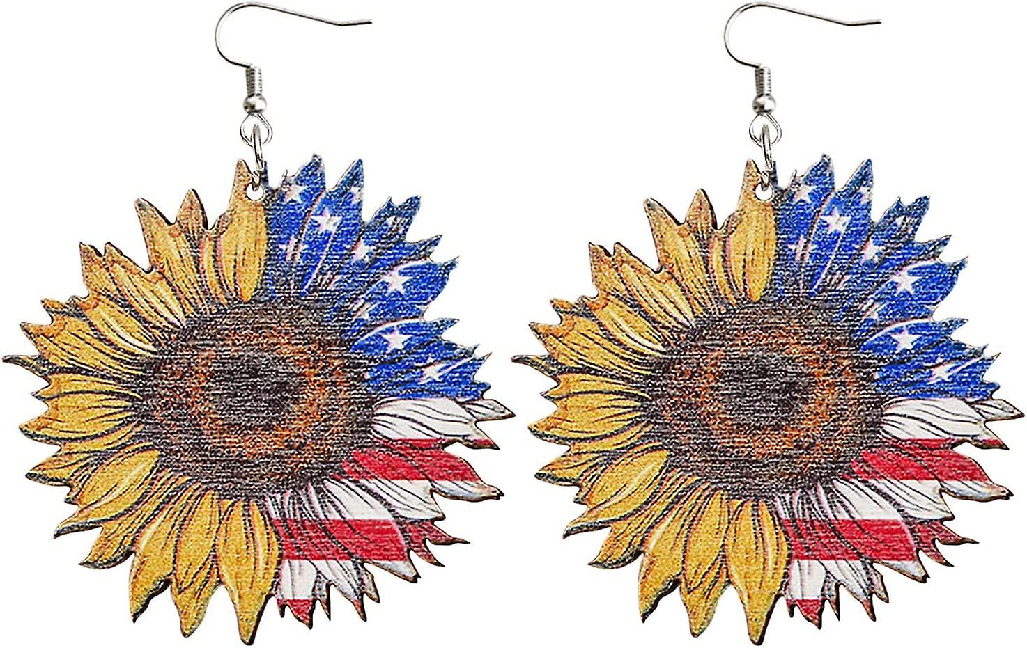 Usa American Flag Dangle Interesting Drop And Sunflowers Shape Bohemian Earrings For Women Patriotic 4th Of July Independence Day Gift Star Stripes Wo