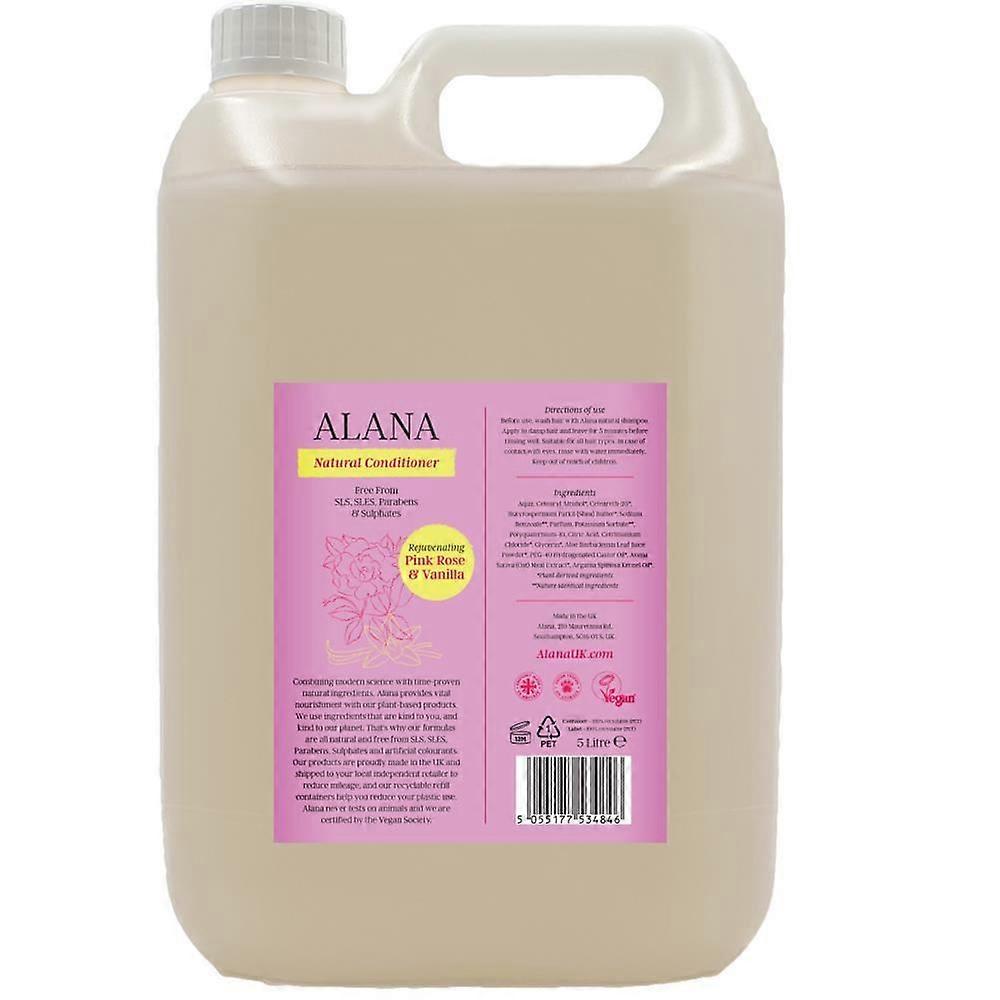 Experience the nourishing power of nature with the Alana Pink Rose & Vanilla Natural Conditioner, now available in a convenient 5L refill container. Crafted with care, this conditioner combines the delicate essence of pink rose with the warm, comforting aroma of vanilla to leave hair feeling soft, smooth, and beautifully fragranced.Formulated from plant-derived ingredients, this conditioner is free from harsh chemicals such as SLS, SLES, parabens, sulphates, and artificial colourants, making it an ideal choice for those seeking a gentle yet effective hair care solution. It is vegan certified and cruelty-free, ensuring no animal testing at any stage of production.Produced in the UK, Alana is committed to sustainability and ethical practices. The 5L refill bottles are made from 100% recycled PET sourced from waste collected on beaches and surrounding environments, supporting ocean cleanup efforts. This environmentally responsible packaging helps reduce plastic waste while providing excellent value for both retailers and consumers.Perfect for salons, hotels, and eco-conscious households, the 5L refill container measures 130mm wide x 180mm deep x 280mm high, with the optional Alana hand pump adding approximately 140mm in height for easy dispensing. Available alongside 500ml and 20L refill options, this conditioner meets diverse volume needs while offering a fair retailer margin and competitive pricing.Choose Alana Pink Rose & Vanilla Natural Conditioner to deliver exceptional hair care that aligns with your valuesnourishing, sustainable, and free from harmful additives. Ideal for daily use on all hair types, it restores moisture, enhances manageability, and leaves hair with a subtle, natural fragrance that delights the senses.