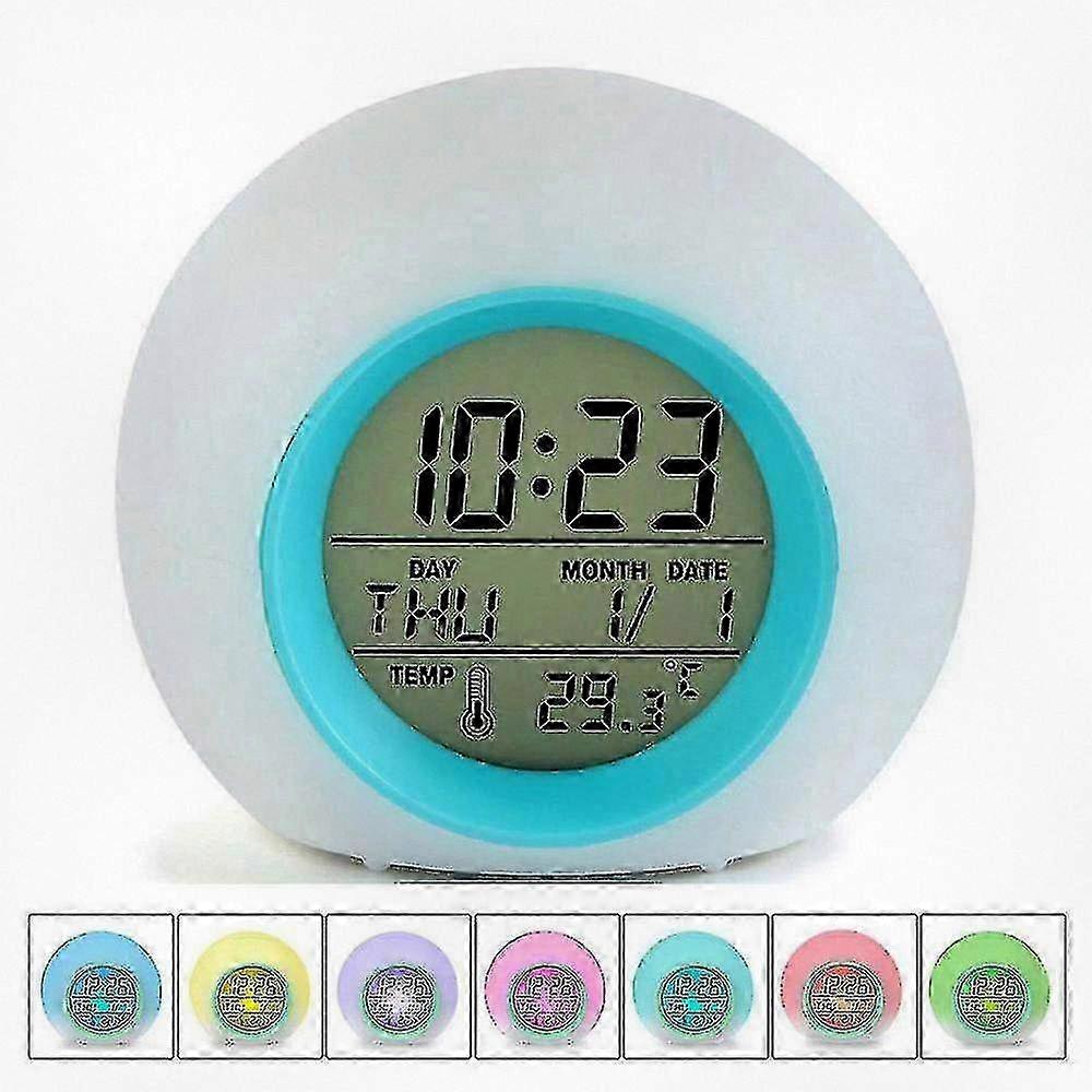 7-color backlight kids' alarm clock features a one-tap activated soft glow, perfect for night-time ambiance. Functions as a wake-up light, night light, or mood lighting, ideal for bedrooms. Made from high-quality, kid-safe ABS material, ensuring peace of mind for parents. A great gift choice for children. Clear LED display shows time, date, and temperature. Easily switch between 12/24-hour formats and Fahrenheit/Celsius. Compact, round design adds a charming touch to nightstands or desks, enhancing home decor.