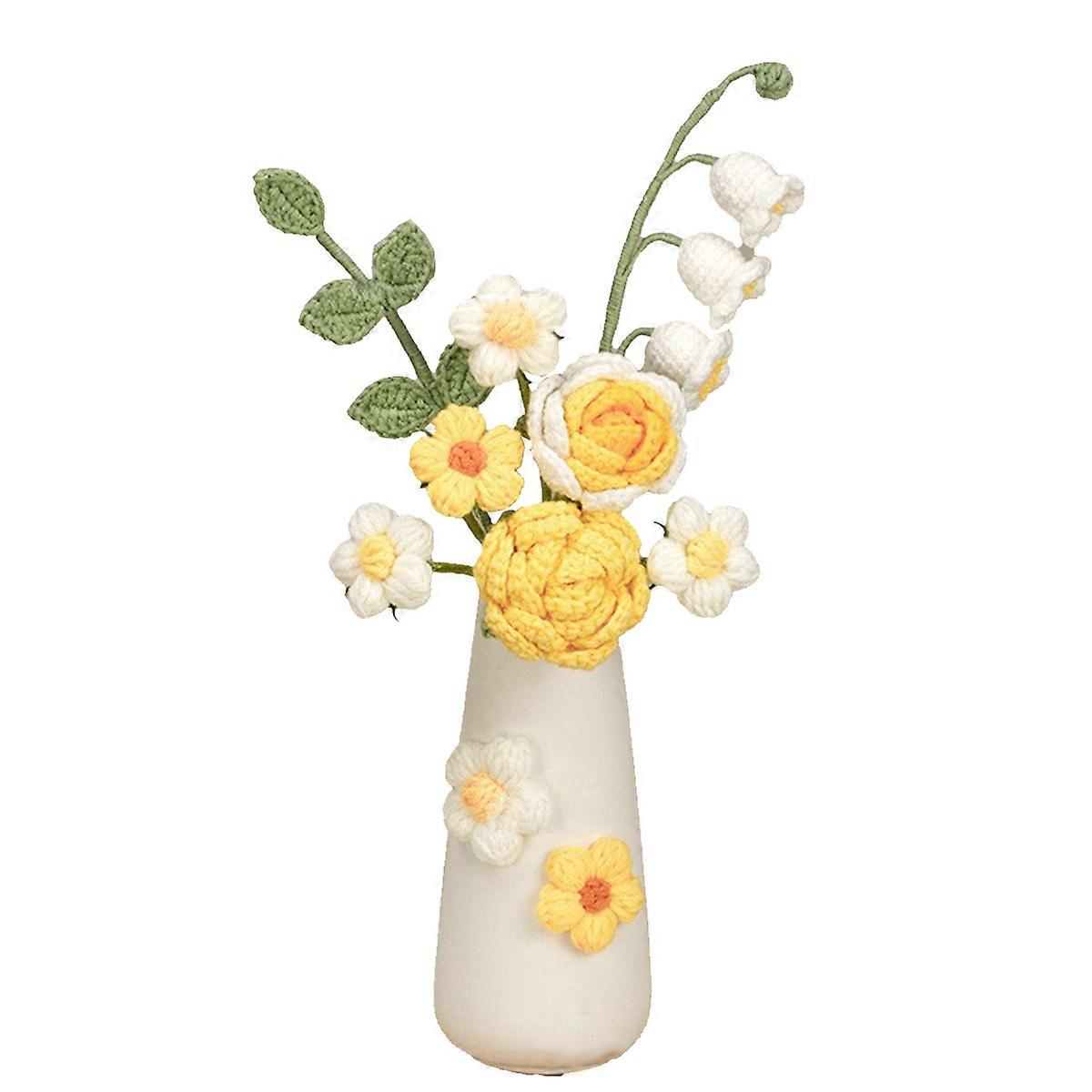 Yellow Simulation Woolen Flower Handmade Knitting Artificial Flower Crochet Knitted Flower with Ceramic Vase Table Flower Gift