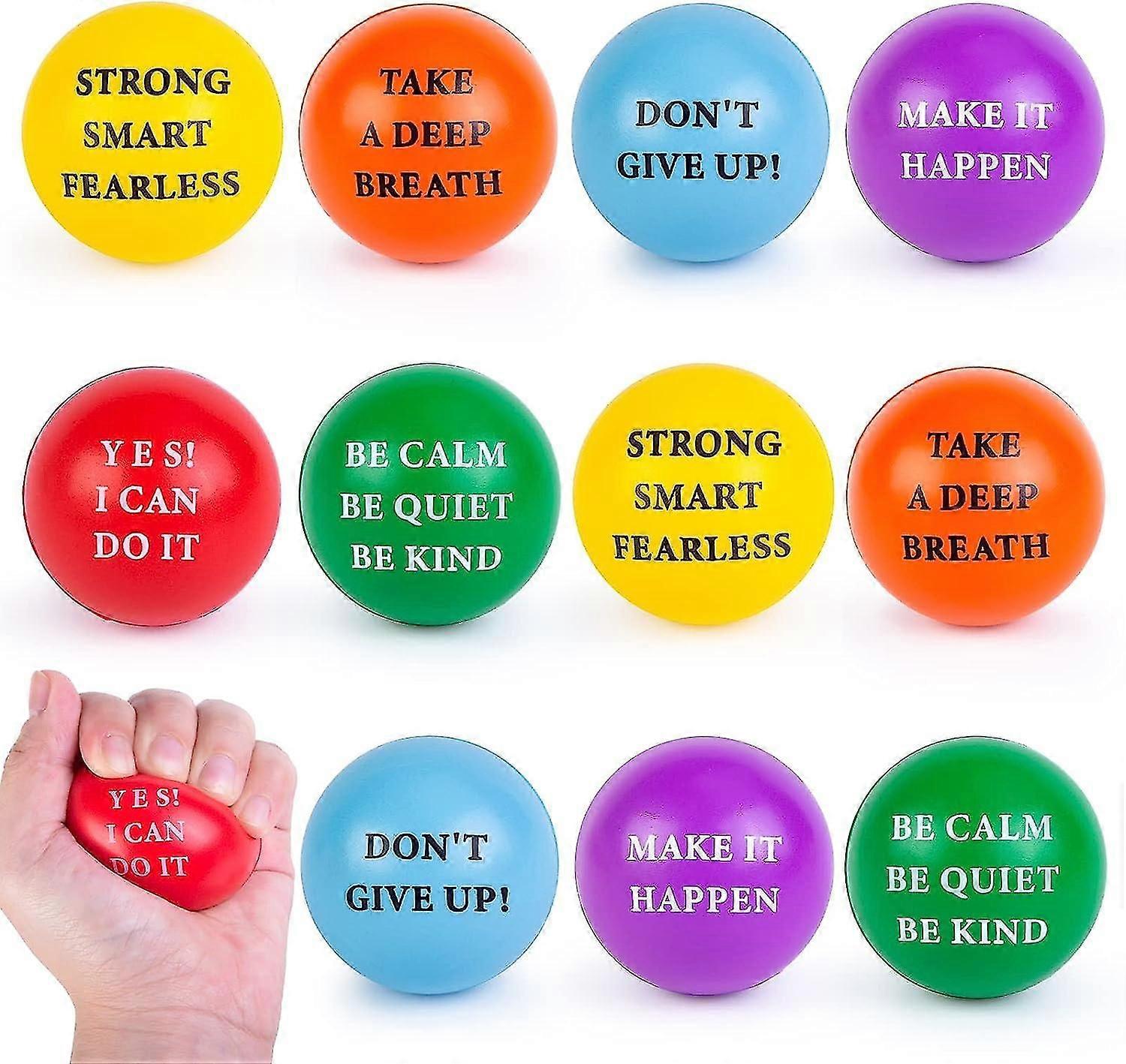 SUPER VALUE PACK - 12PC Inspirational Stress Balls (2" in diameter), 6 different designs including "YES! I CAN DO IT", "BE CALM, BE QUIET, BE KIND", "MAKE IT HAPPEN", "STRONG, SMART, FEARLESS", "TAKE A DEEP BREATH" and "DON'T GIVE UP!". Suitable for various occasions. All packed in a clear box, easy to carry and store. VIBRANT COLORS & STRESS RELIEF - These motivational balls come in 6 different colors, bright and vibrant, a visual feast to eyes, when reading words on these balls, you will become calm and positive. PREMIUM QUALITY - Our stress balls are all made of high-grade foam and PU, nontoxic and odorless, 100% child-safe. 2 inch compact size, suitable for small hands to grip. No matter how hard you squeeze these balls, they will snap back instantly, durable and reusable. WIDE RANGE OF USES - Our motivational balls are suitable for individuals of all ages and for use in any setting, these stress balls have versatile applications. They are ideal for office stress relief and provide slight relief for conditions like arthritis or carpal tunnel syndrome. As a family leisure item, they enhance interaction between parents and children. Even little dogs cannot leave teeth marks on them when used as pet toys. MULTIPLE FUNCTIONS - These comfortable stress balls serve various purposes. Not only do these foam balls aid in better concentration, but they also keep your fingers engaged and strengthen them. These stress balls can be used as therapeutic stress relievers, and the positive messages on their surface promote a growth mindset, especially among young individuals.