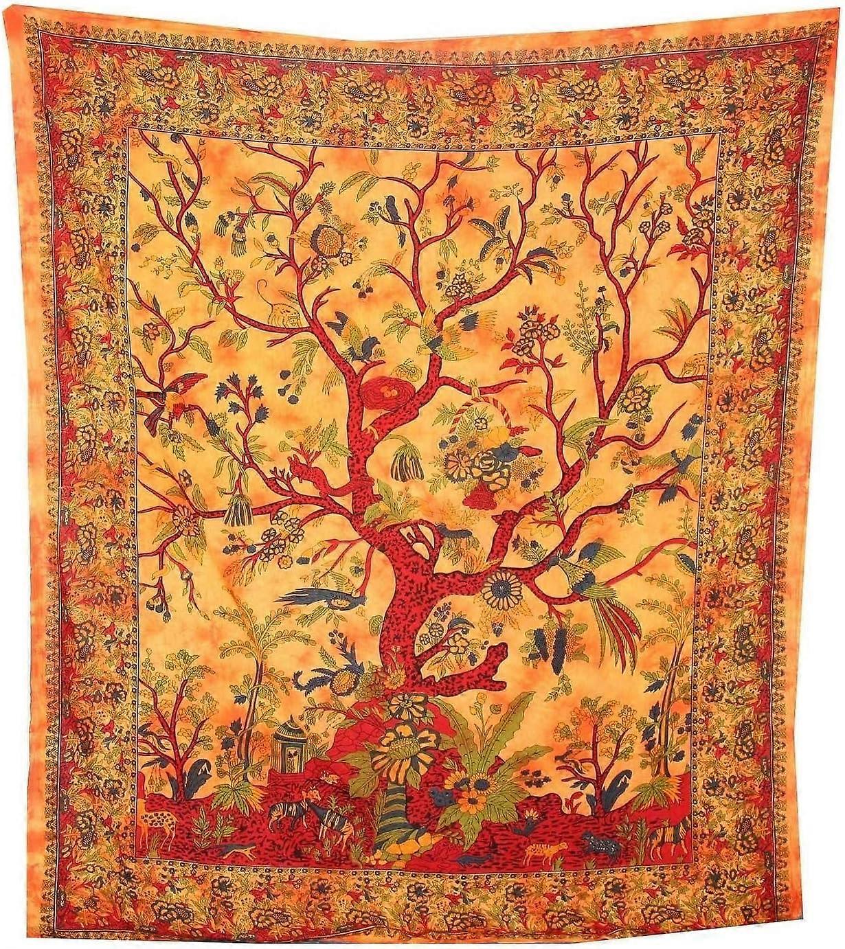 Indian Blanket Wall Hanging Tree of Life Orange 230x180cm Multicolor Birds Flowers Cotton Style Tie Dye Bedspread Sofa/Armchair Throw