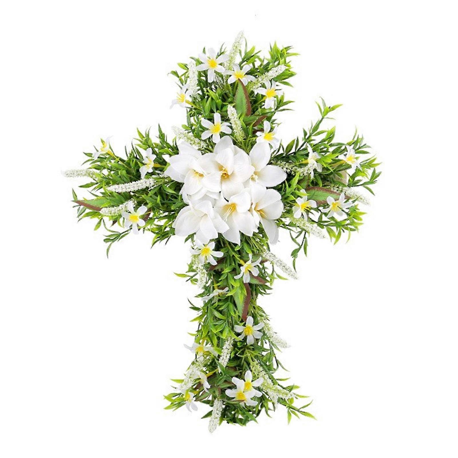 Easter Wreath Door Hanging Decoration Cross Lilys Flower Wreath for Front Door Decor Christian Lilys Flower Easter Decor