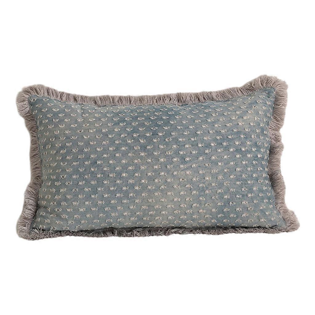 Vintage washed denim blue, geometric pillowcase, distressed ripped jacquard design, tassels trim around pillowcase.