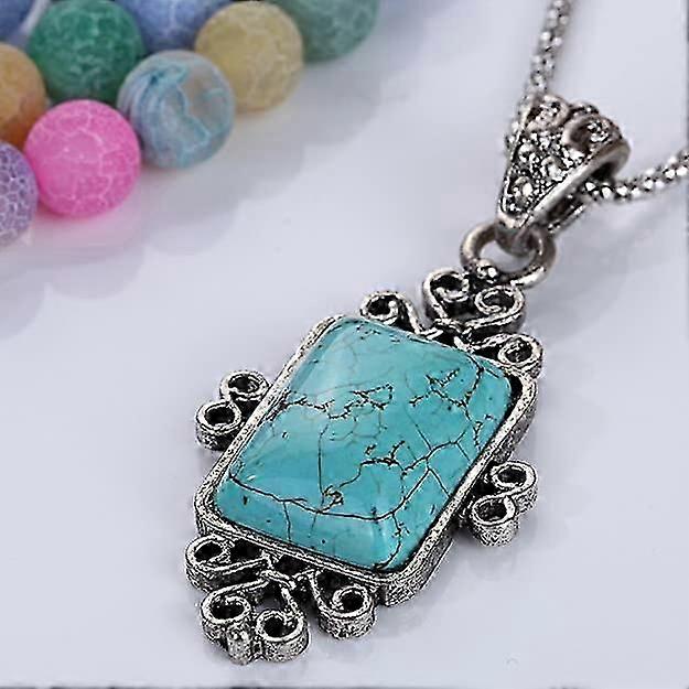 Vintage Tibetan Silver Elegant Carved Rectangle Turquoise Pendant Necklace Earrings Jewelry Set