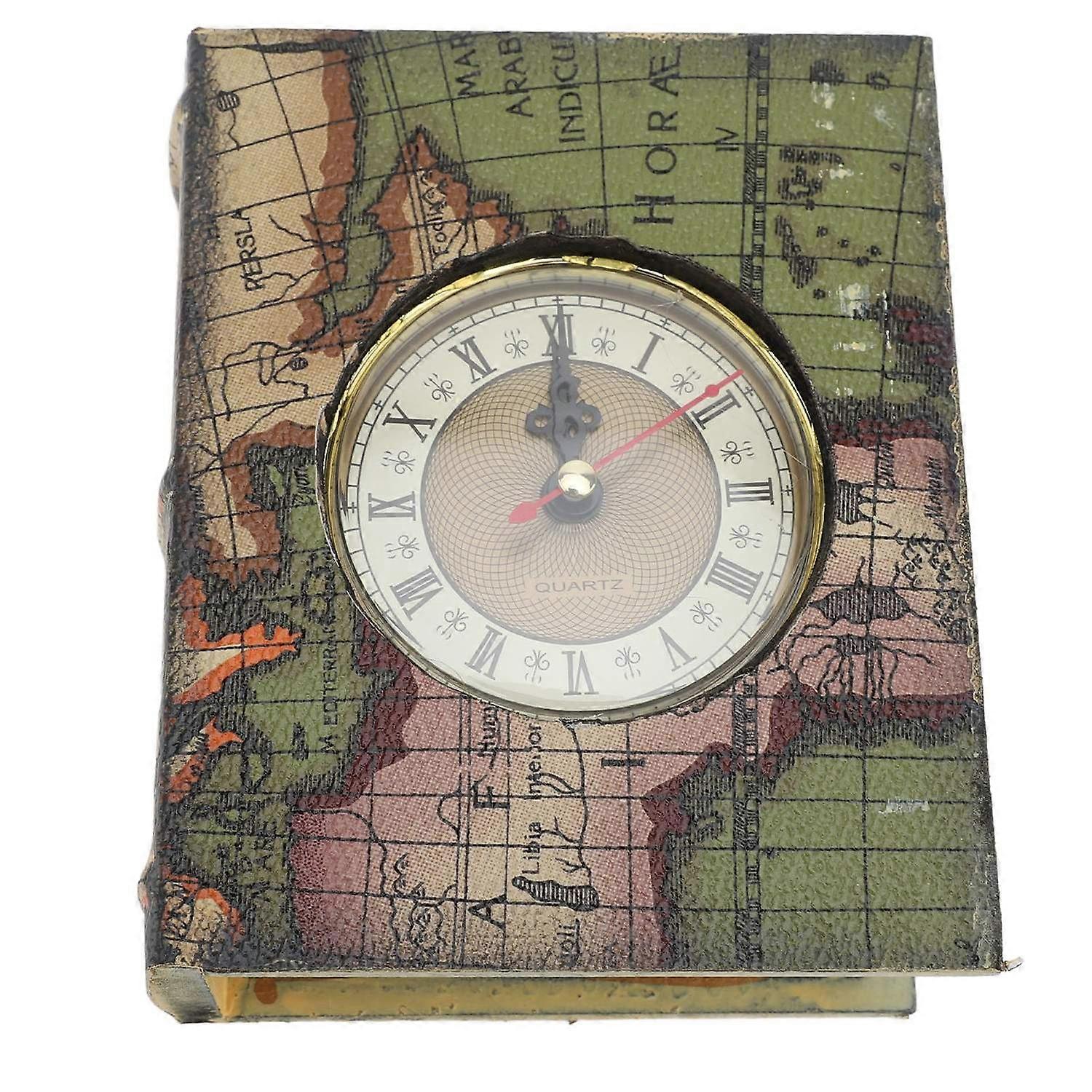 Feature: 1. Vintage Book Storage Box: This storage box combines decoration and practicality, featuring a retro book style and storage space, also has clock function, adding a unique art ambiance to your bookshelf or desktop. 2. Excellent Materials: This decorative book box is made of excellent density board, sturdy and reliable, with a leather appearance, providing an elegant appearance and maintaining beauty and stability. 3. Storage Solution: After opening the lid, the book decoration can become a compact storage box, easily storing keys, notes, stationery, jewelry, and other small items, keeping your desktop tidy and orderly. 4. Elegant and Vintage: This decorative box has a vintage appearance that can easily blend into various home and office environments, showcasing your unique taste and making it an elegant desktop ornament. 5. Photography Prop: Specially designed for photography enthusiasts, this storage box can be served as a photography prop, its book appearance and built in clock details can create a rich scene ambiance. Specification: Item Type: Simulated Book Storage Box Material: Synthetic Wood, Leather Size: Approx. 14.5 x 12 x 5.5cm / 5.7 x 4.7 x 2.2in Battery: 1 x AA Battery (Battery not included). Package List: 1 x Simulated Book Storage Box Note: Please note that map pattern locations will be shipped randomly.
