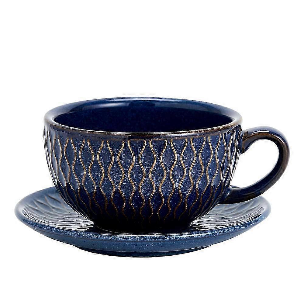 Vintage 12 oz Embossed Blue Ceramic Latte Art Cappuccino Cup with Saucer 2025