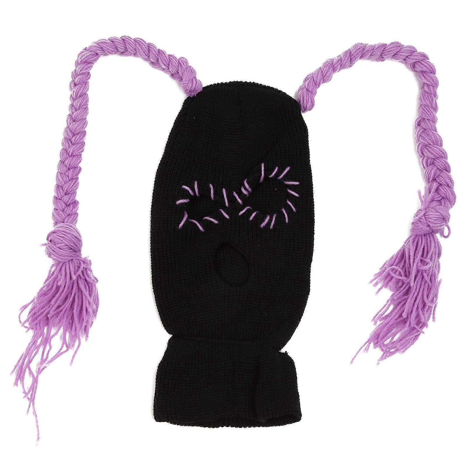 Winter Balaclava Beanie Hats with Wig Decorations Pranky Knitted Hat Full Face Ski Masks Warm Knit Hat for Adults black hat purple hai