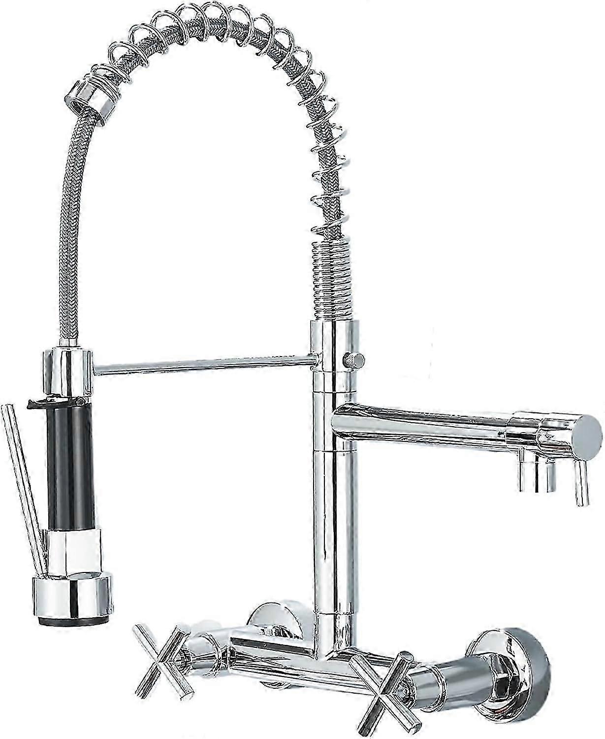 Wall Mount Kitchen Faucet, 8 Inch Center Commercial Sink Faucet with Pull Down Sprayer, 2 Handle Wall Mount Faucet for Kitchen Sink, Brushed Nickel