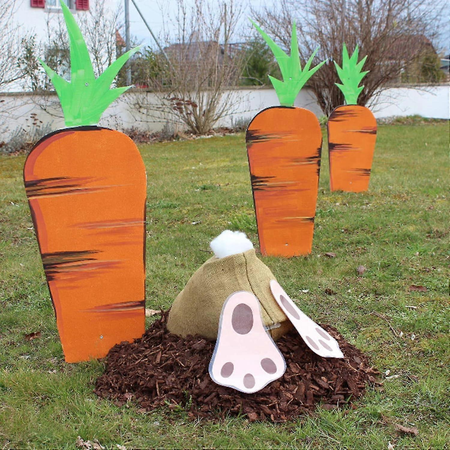 EASTER DECORATIONS Enhance the festive atmosphere of Easter with our adorable bunny and carrot signs. These eye-catching decorations can be placed on your patio or lawn and add fun and charm to your Easter party.CHARMING SCENARIO DESIGN Create a vibrant and playful scene in your garden by inserting these Easter garden stakes. On a sign is an adorable rabbit playfully stuck in a hole and is very cute.HIGH QUALITY MATERIAL Our pretty Easter bunny and carrot outdoor signs are made of durable plastic cardboard and designed to last. The butt of the rabbit is made of burlap with cotton, giving it texture and a touch of playfulness.EASY ASSEMBLY Our colorful bunny welcome signs are conveniently printed and cut, making assembly a breeze. Simply insert the stakes into the ground and you can display these adorable decorations.Versatile outdoor decoration: these carefully crafted Easter signs are perfect for various outdoor areas, e.g. on the lawn, in the garden, as a door welcome or as a party backdrop.