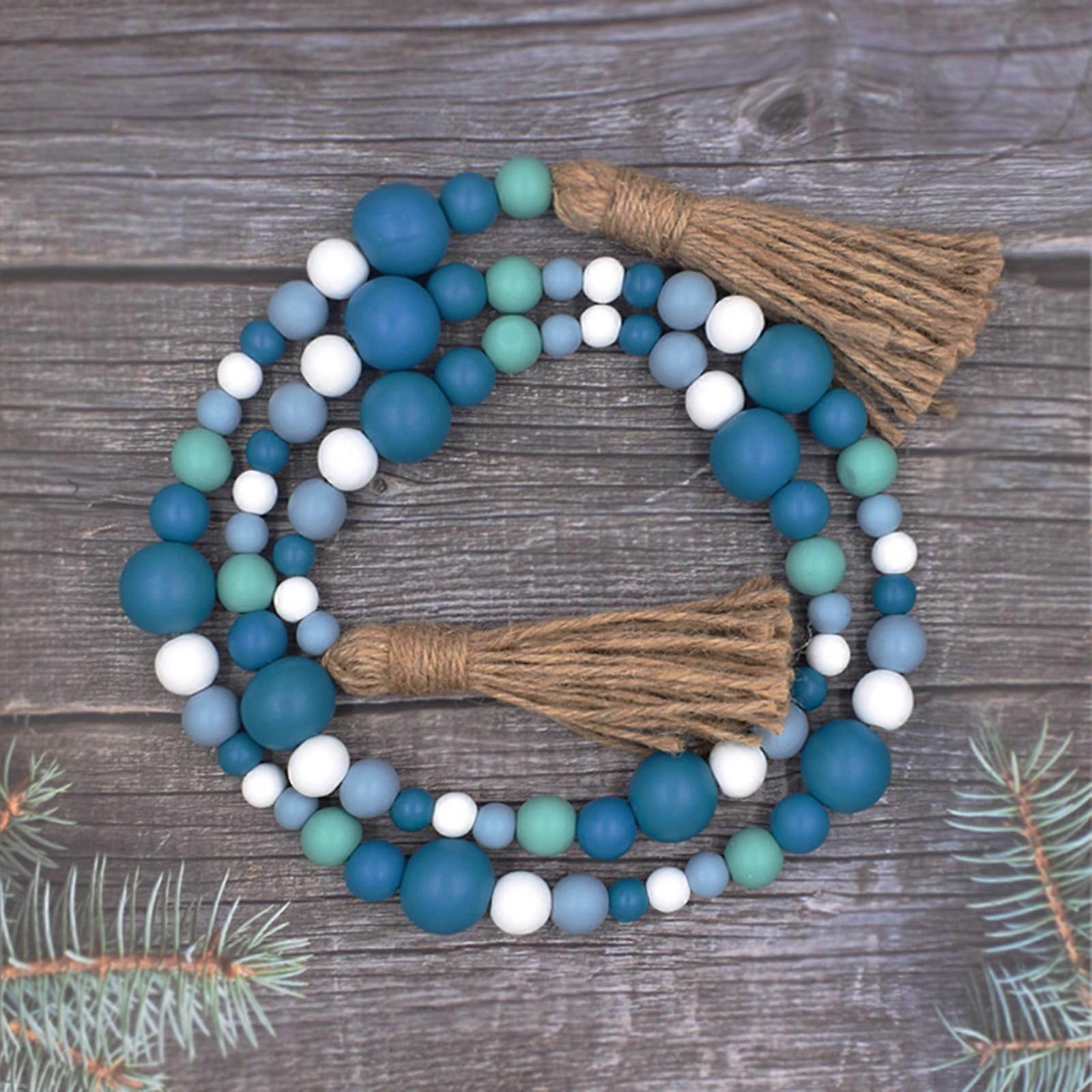 Wood Bead String Beach Wood Beads Blue Wood Bead Garland Tassel Nautical Farmhouse Rustic Beads with Jute Rope Tassel for Coastal Home Room Decor