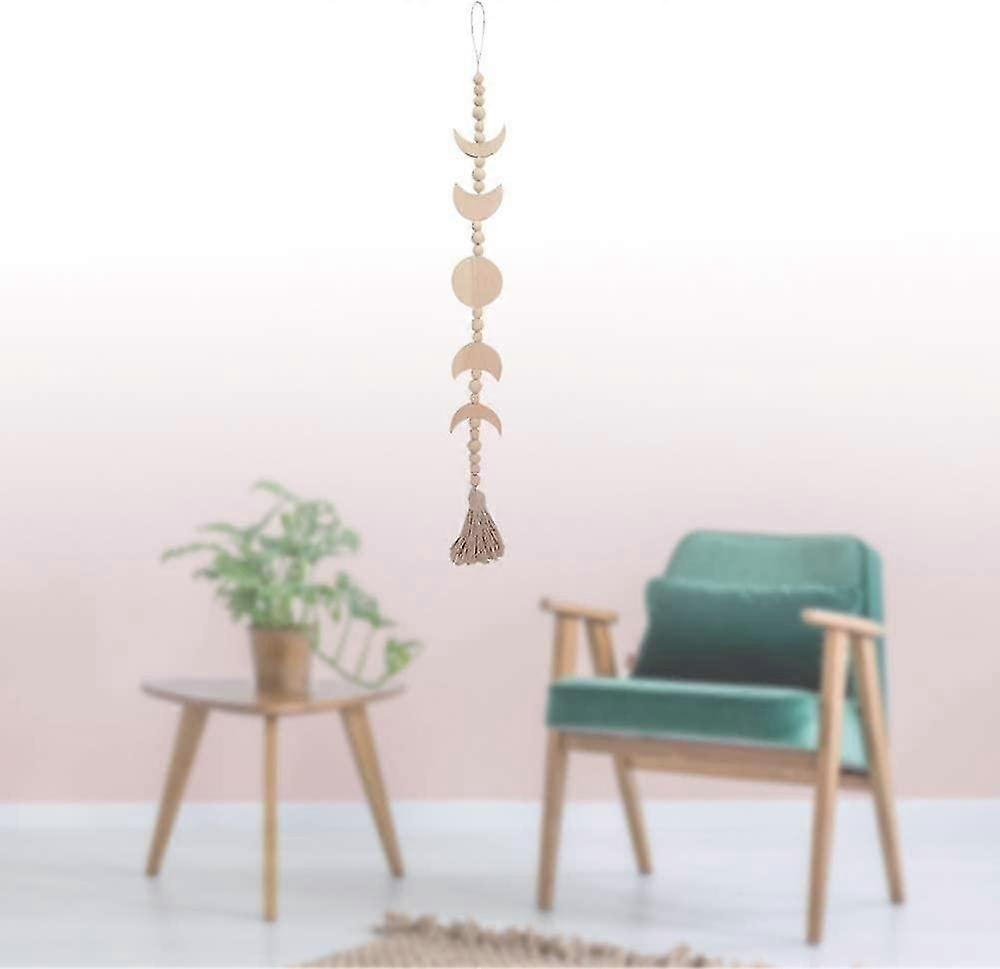 Wood Moon Phase Wall Decor Hanging Bohemian Wall Art Wood Moon Garland Beads Tassel Ornaments for Be