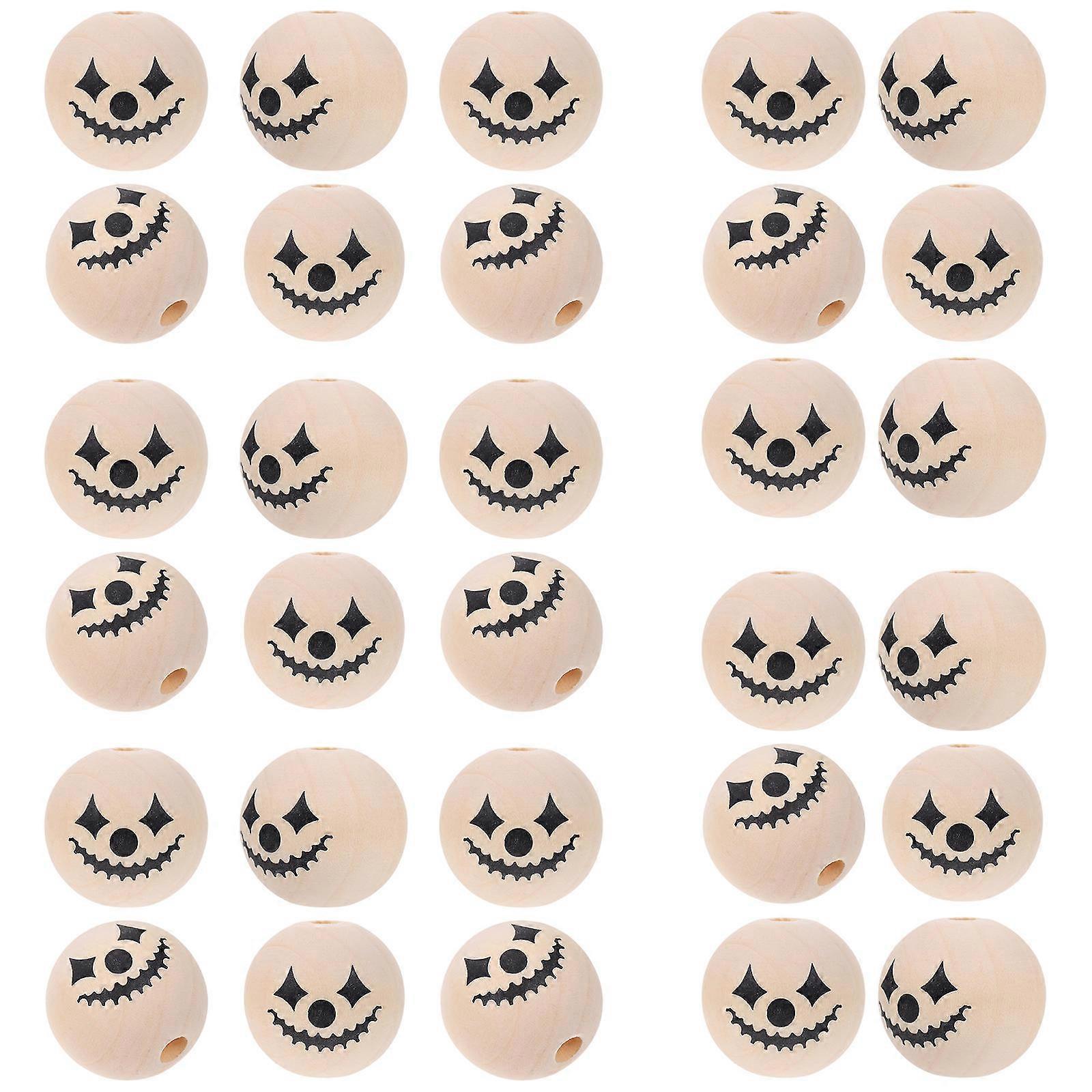 Wood Loose Beads Halloween Pattern Beads For Craft Projects 2.5x2.5cm Round White 30Set