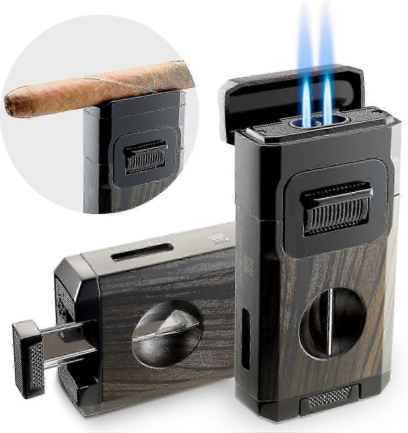 Woodronic Cigar Lighter with V-Cut Cigar Cutter and Cigar Holder, Refillable Dual Jet Lighter Without Butane, Lightweight and Windproof, Cigar Gift fo