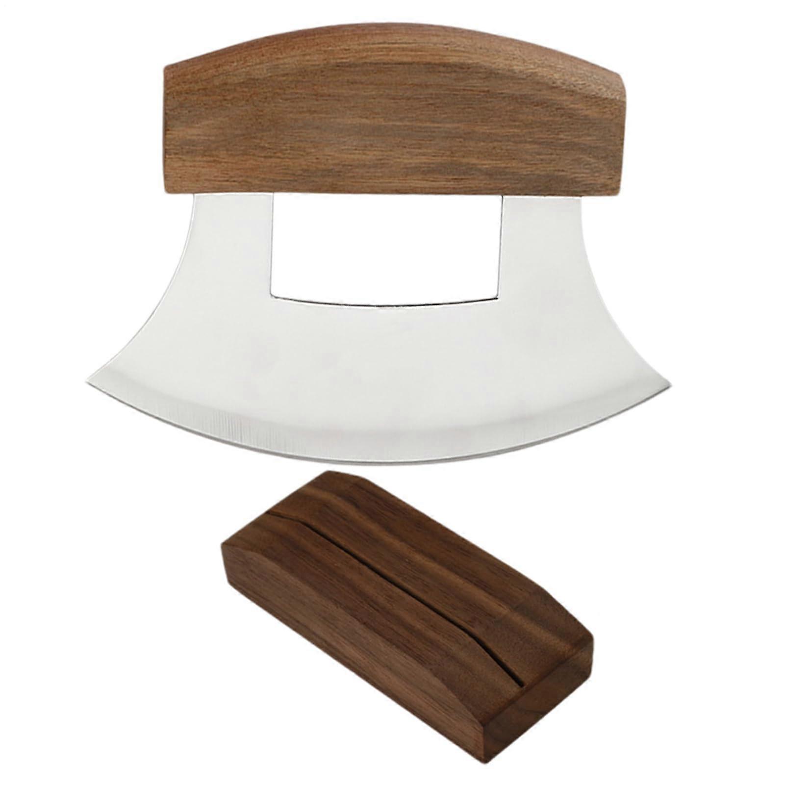 Ulu Alaskan Cutter made of stainless steel with ergonomic nonslip handle and wooden stand