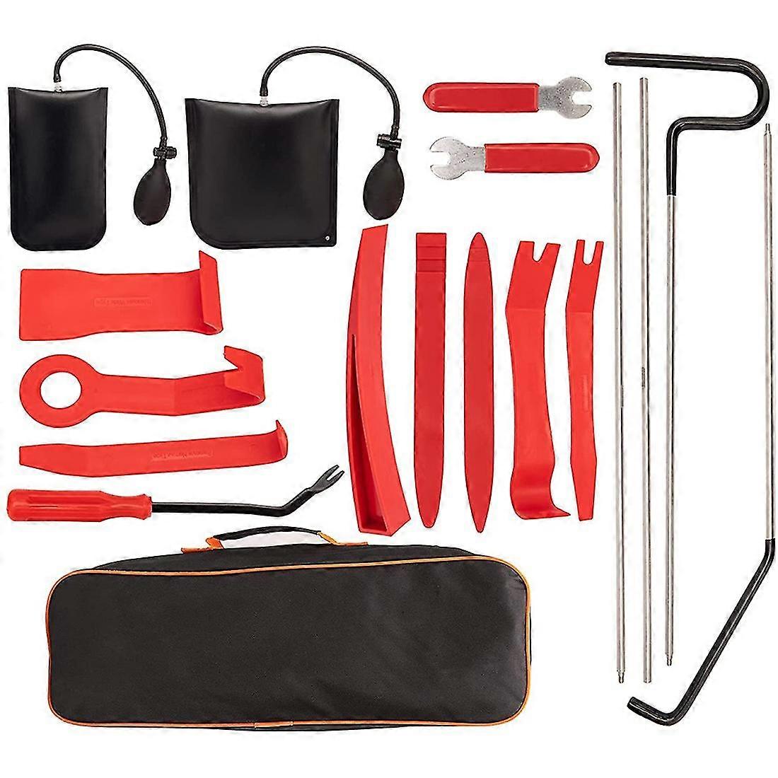 [High Quality Car Unlock Kit]The trim tool set is made of high quality solid material, which is strong and anti-oxidation, not easy to bend. The long handle tool kit is protected by an upgraded soft rubber handle with excellent non-slip effect for easy grip. The hook head is round and will not damage the vehicle. [Professional Car Door Open Kit]A must-have unlock kit for cars, with pump and wedge, suitable for any scene, this car lock out kit can also help you do all the work you need! 1. The groove design is easy to install/remove . 2. Air wedge bag can withstand high pressure and reduce car damage. 3. The connector is upgraded to a non-protruding connection, and the problem of missing connector accessories will not occur [Features of Unlock Door Kit]This is a very affordable professional auto tool kit with air wedge bag pump, each piece is designed to be used flexibly. The Air Wedge Locking Kit is efficient and safe to use and only takes a few minutes to get the job done. The car unlock kit will not damage your vehicle. Air Wedge Kit - Has Internal Reinforcement, Inserts Air Pump and Inflates, Easy Tool Insertion, Less Damage to Doors [18 Pieces Car Lock Kit]Professional unlocking car door kit, Make your life more convenient. This car trim removal tool kit is suitable for removing and installing car stereos, door panels, wiring, signs, window trim and other car interiors, as well as boat and navigation window trim repairs and furniture maintenance color:Red Material:Metal + Plastic Package Contents: 4 x Long Reach Tools 2 x Air Wedge Pumps 7 x Trimming Tools 1 x Fastener Remover 1 x Red Wedge 2 x Mini Wrenches 1 x Bag Only the above package content, other products are not included. Note: Light and different displays may cause the color of the item in the picture a little different from the real thing. The measurement allowed error is +/- 1-3cm.