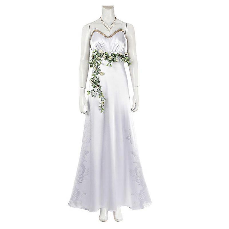 Bring to life the elegance and charm of Aerith Gainsborough from Final Fantasy VII Rebirth in her stunning Gold Saucer Solo Dress. This breathtaking white satin gown is inspired by her iconic singing appearance, radiating purity, grace, and celestial beauty. A must-have for fans of the FFVII universe, this cosplay is ideal for high-end conventions, fantasy photoshoots, or formal cosplay events. Costume Includes: White full-length gown silky smooth, slight shimmer, subtle floral patterns on hem Floral waist belt faux greenery and blossoms wrap gracefully across the torso Necklace delicate double-chain design with pendant (non-metal) Adjustable clear shoulder straps comfortable support while remaining visually seamlessMaterial Information: Main Dress: High-grade satin polyester soft sheen, excellent drape, non-elastic Waist Accessory: Artificial vines and flowers lightweight, securely stitched Neckpiece: Resin and alloy imitation Lining: Breathable smooth taffeta ensures comfort for extended wearAvailable Sizes: XS / S / M / L / XL / XXL / XXXL Tailored silhouette. Please refer to the detailed size chart for your best fit.