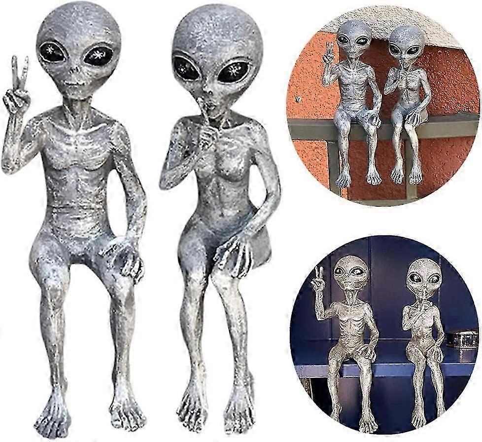Alien Statuette,Set of 2 Space Alien Statues,Extra Terrestrial Statue,Garden Figurine,Resin Sculpture for Home Office Garden Patio Yard Lawn