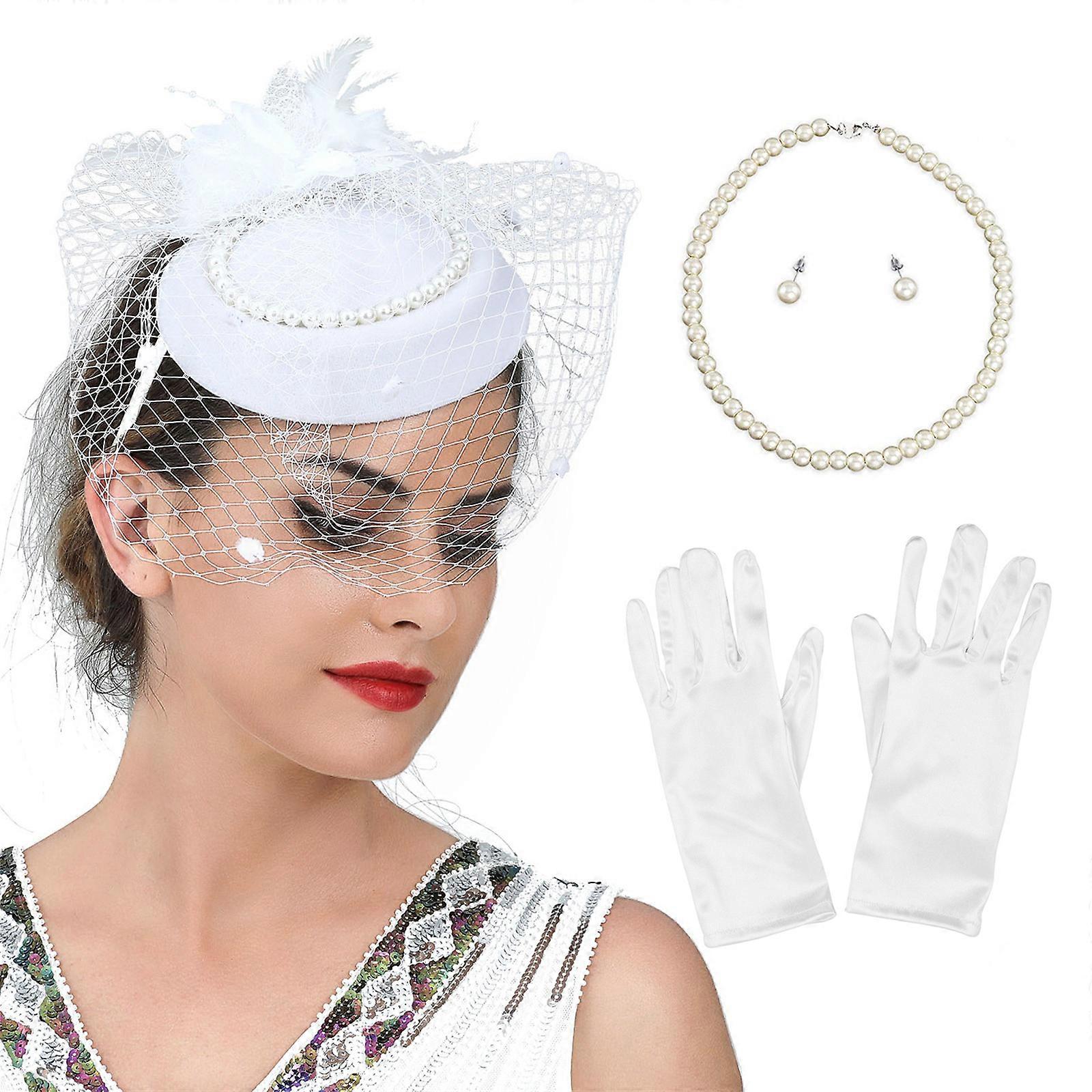 Vintage Medieval Headband with Etiquettes Gloves Delicate Pearl Earring&Necklace Set Festival Party Ladies Costume Props White
