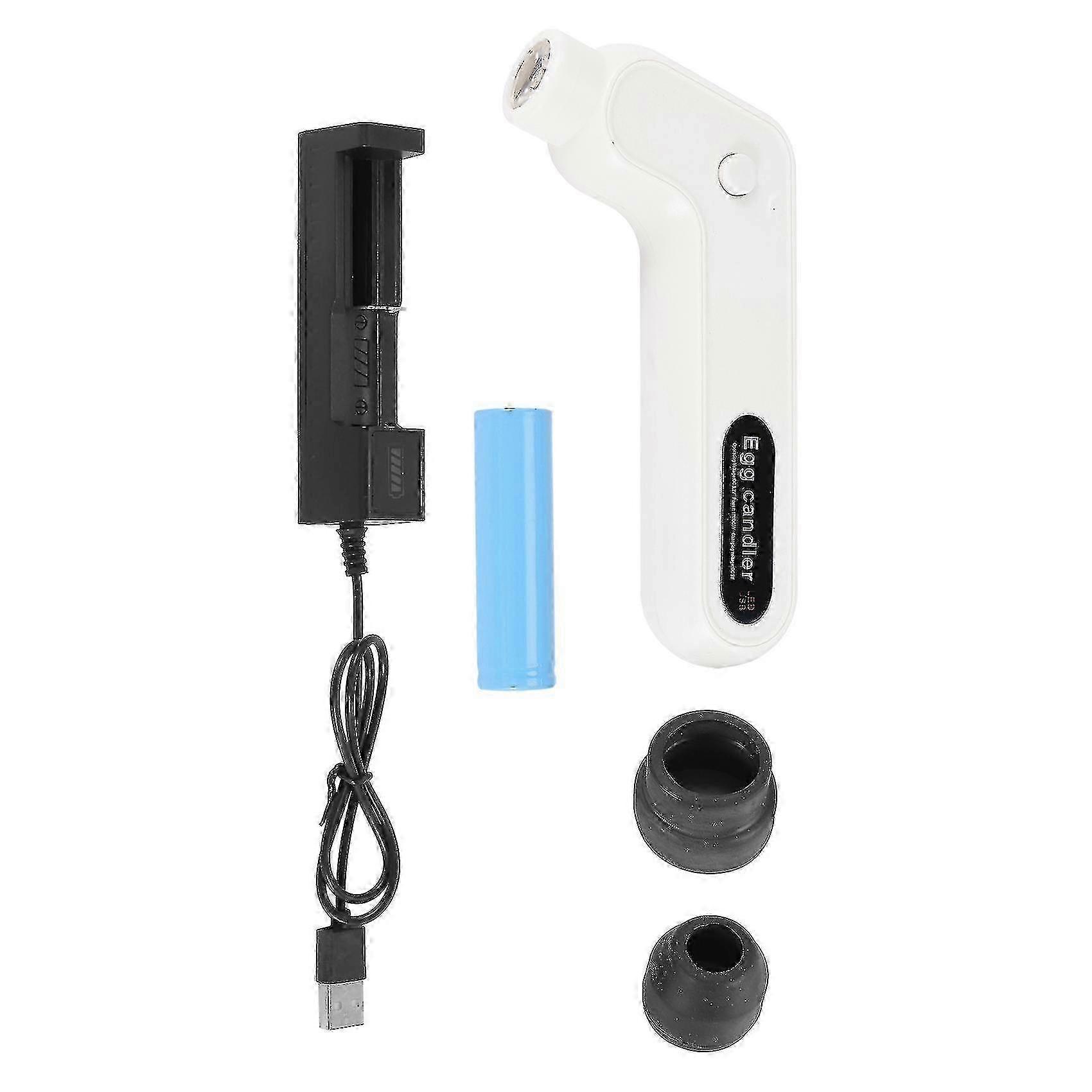 COOL Light,No Heat Damage the Eggs: Egg candler cool and strong light, no heat damage to egg embryo and perfect for monitoring egg development. Easy to Use: Handle ,more humane,Durable with easy button. Durable and Work for Long Time: If you are worry about some place no power or inconvenient to use Power Cable,This type is fit ,Charge one time can use 24hours.(This data is measured by laboratory. The actual charging and operating time can be different.) Two Candler Covers: Egg Tester come with two rubber candler covers that will cover about all kinds of egg types. Portable & Convenient: This candler can be used directly after charging without plugging in which is easy to carry and can be used indoors or outdoors. Colour: white Material: plastic Package Contents: 1 x Egg Candler Tester 1 x usb charging stand 2 x rubber candler covers 1 x battery Only the above package content, other products are not included. Note: Light and different displays may cause the color of the item in the a little different from the real thing. The measurement allowed error is +/- 1-3cm.