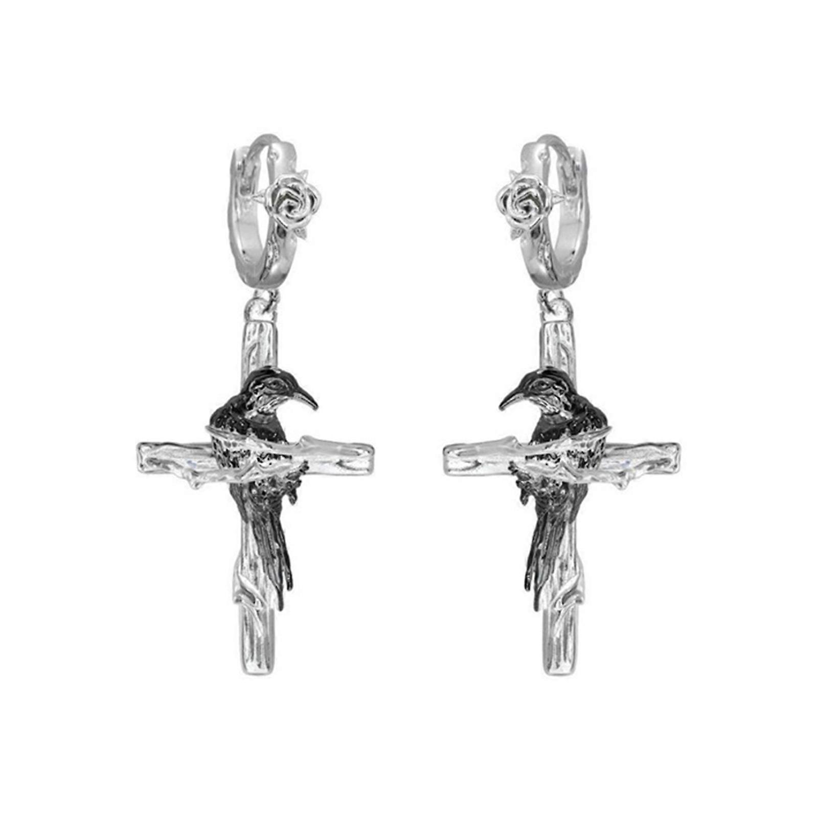 Edgy Gothic Crosses Earrings With Crow Charm Punk Ear Studs Jewelry for Women Sophisticated Alloy Long Dangle